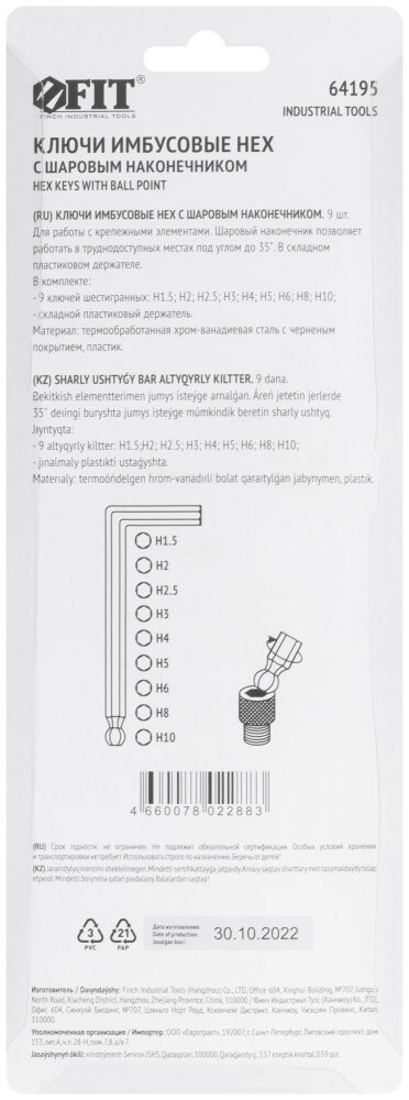 Полное описание товара Ключи шестигранные CrV средние с шаром (1.5-10 мм) 9 шт (FIT) 64195