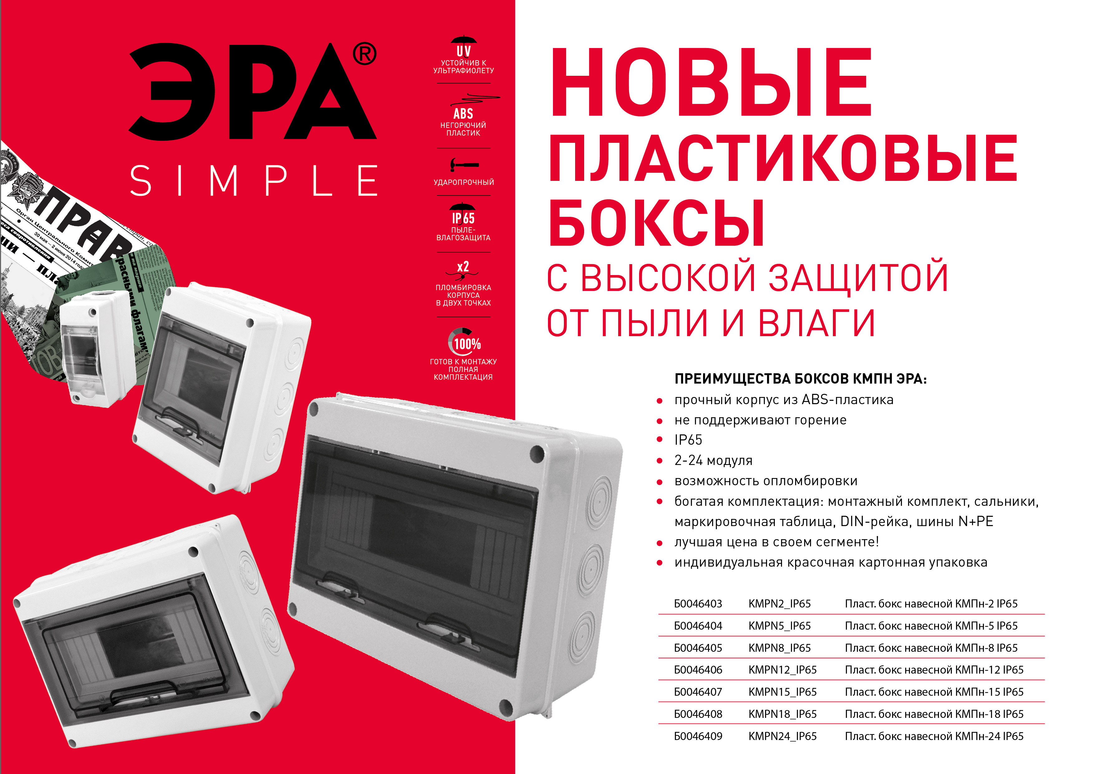 Корпуса модульные пластиковые серии КМПн IP65 ЭРА- предназначены для сборки распределительных щитов с использованием модульной аппаратуры, для ввода и распределения электрической энергии, а также защиты сетей напряжением до 400 В от токов перегрузки и короткого замыкания. Повышенная степень защиты корпуса позволяет использовать их в помещениях с большим содержанием пыли и влаги, например, в гаражах, производственных помещениях, подвалах, автомойках, на складах, а также на открытом воздухе. Преимущества корпусов : Изготовлены из пластика, не поддерживающего горение. Высокая технологичность и простой и быстрый монтаж. Высококачественный полиуретановый уплотнитель обеспечивает дополнительную защиту корпуса от влаги и пыли. Возможность опломбировки корпуса. Для защиты пыли и влаги использован принцип тоннельного уплотнения. Расширенный диапазон рабочих температур от -40°С до +75°С. Материал корпуса устойчив к воздействию ультрафиолета.