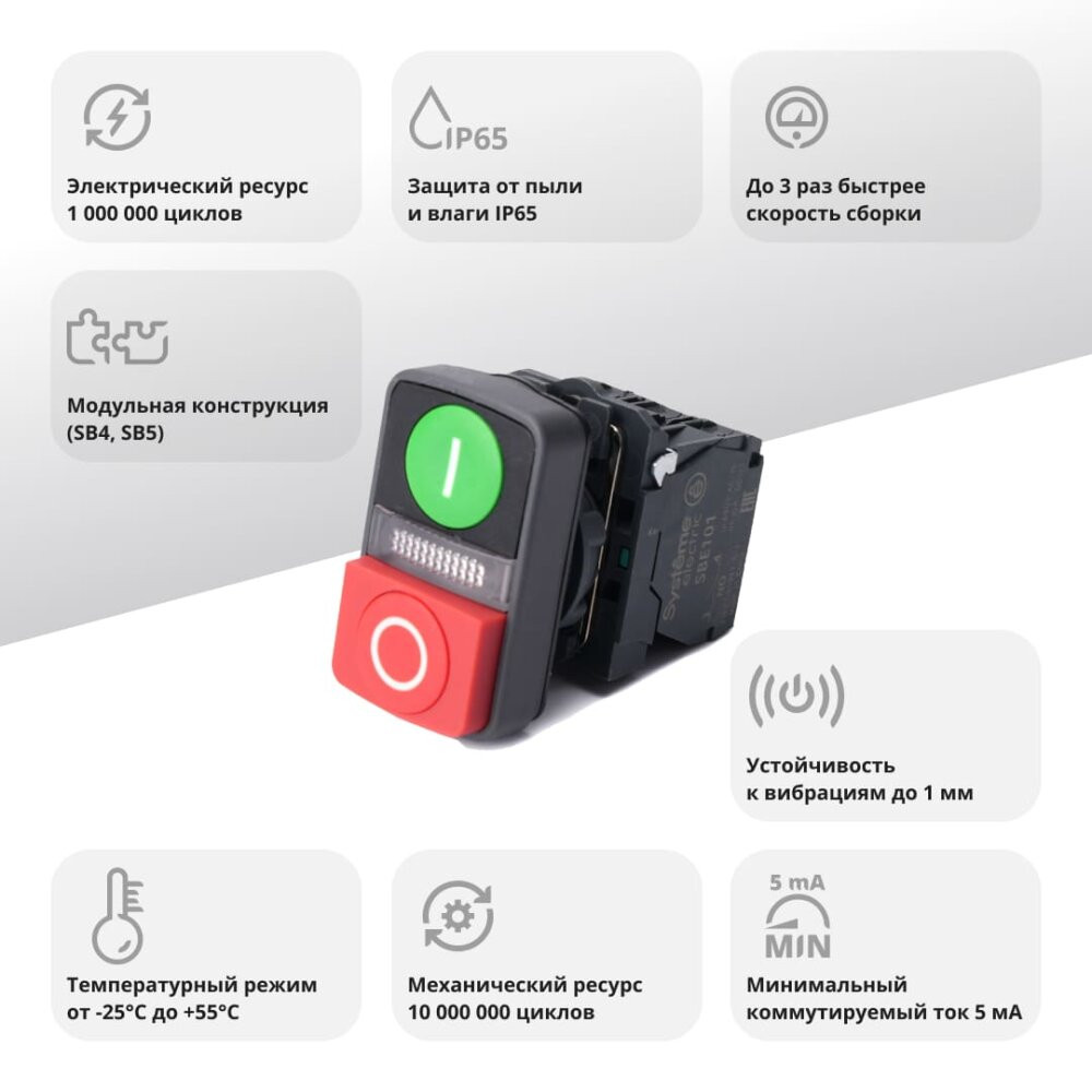 Полное описание товара Кнопка двойн SB5 в сборе модуль 22мм pI+сиг ламп+кр выстО пластик 230ВАС 1НО+1НЗ (Systeme Electric) SB5AW73731M5