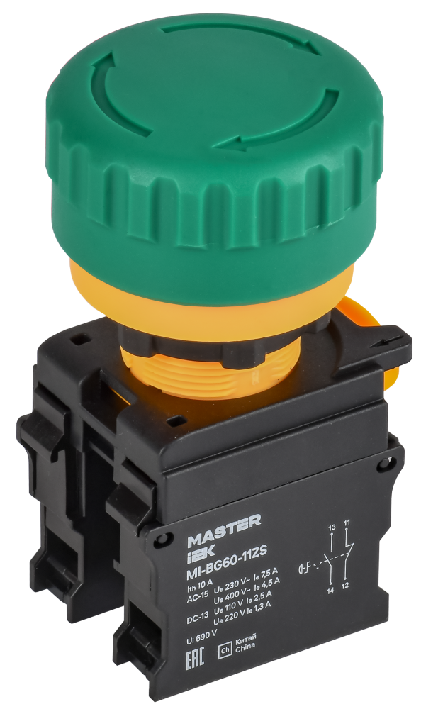 Полное описание товара Кнопка Грибок поворот. с фикс. 1NO+1NC зелёная MASTER (IEK) MI-BG60-11ZS-3-23-K06