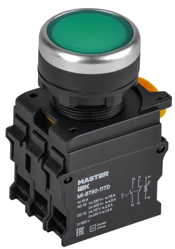 Полное описание товара Кнопка с подсвет. и фикс. d=22мм 1NO+1NC зелёная MASTER (IEK) MI-BT60-11TD-3-11-K06