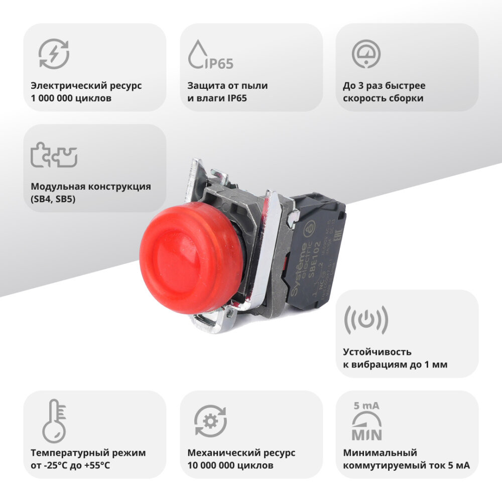 Полное описание товара Кнопка SB4 в сборе модульная 22мм выступающая красная с возвратом металл 1НЗ (Systeme Electric) SB4BP42