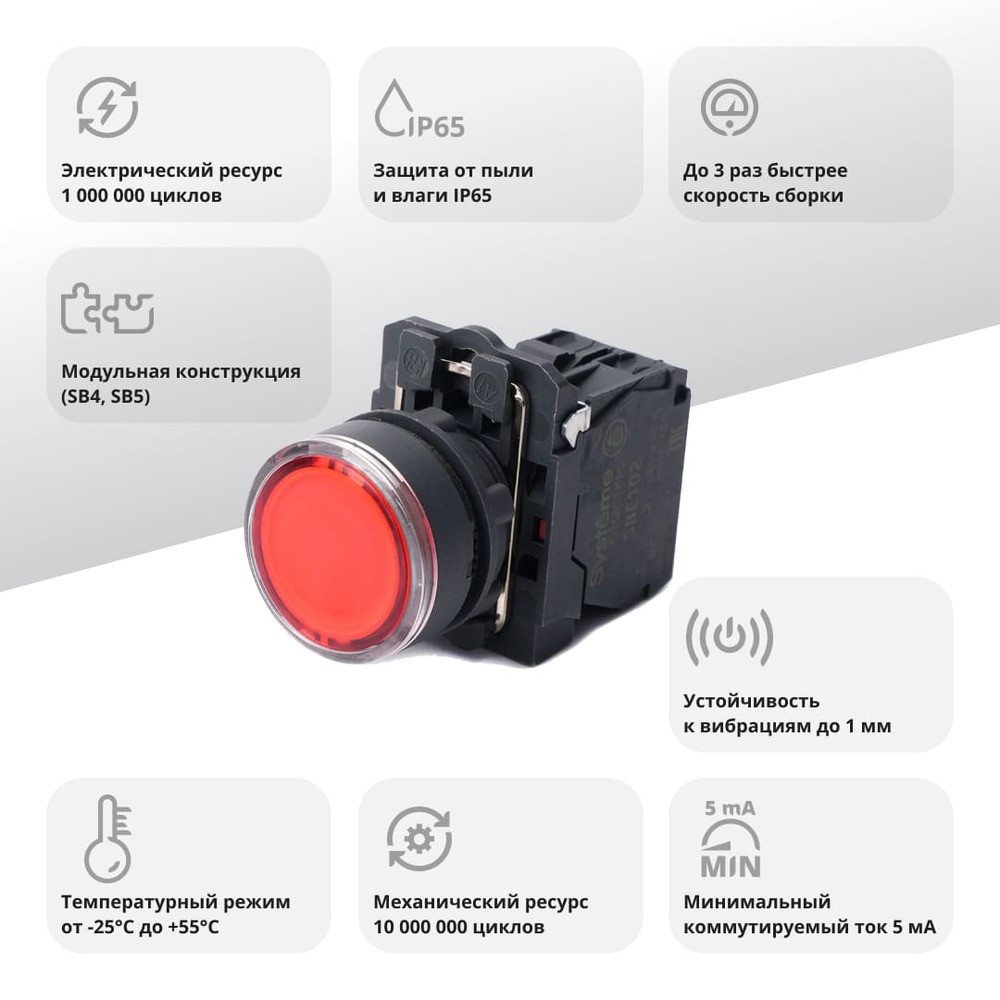 Полное описание товара Кнопка SB5 с подсветкой в сборе модульная 22мм красная пластик 24ВDC 1НЗ (Systeme Electric) SB5AW34B2