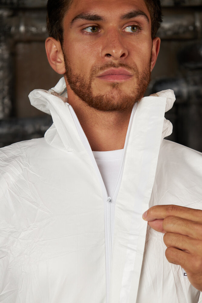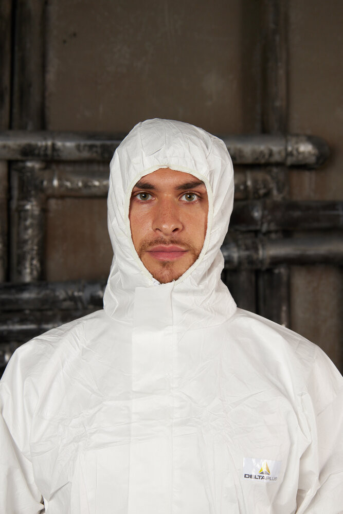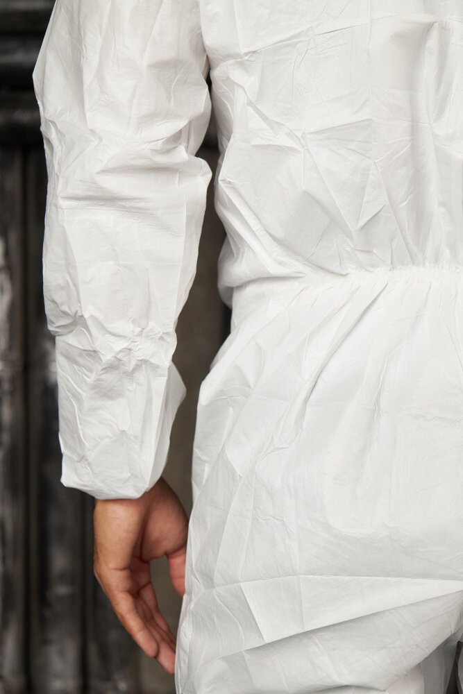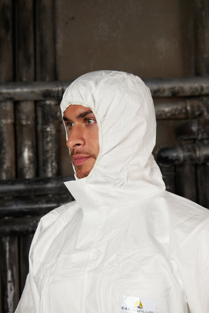 Комбинезон с эластичным капюшоном DT117 , белого цвета. Двухзамковая застежка-молния, закрытая защитной планкой. Эластичная резинка вокруг лицевого выреза капюшона, на талии и лодыжках. Трикотажные манжеты. Индивидуальная упаковка.