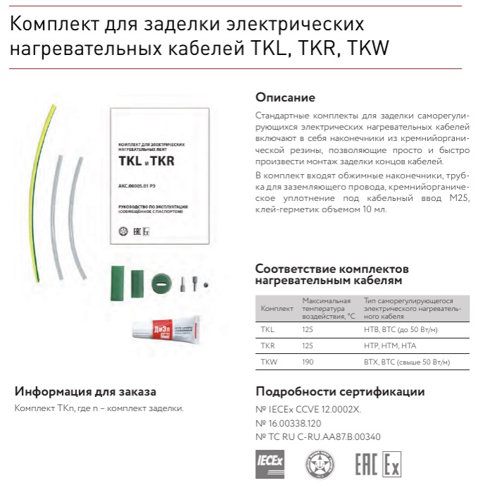 Монтажный комплект для греющего кабеля TKR - стандартный комплект для заделки саморегулирующихся электрических нагревательных лент включает в себя наконечники из кремнийорганической резины, позволяющие просто и быстро произвести монтаж заделки концов лент. Монтаж комплекта осуществляется без использования нагрева. Комплект предназначен для герметичной заделки саморегулирующейся электрической нагревательной ленты НТА, НТР, НТМ, ВТС, ВТСе, НТВ в том числе во взрывоопасной зоне, с максимальной температурой воздействия 125 градусов Цельсия. Гарантия на комплект составляет 1 год с момента продажи.