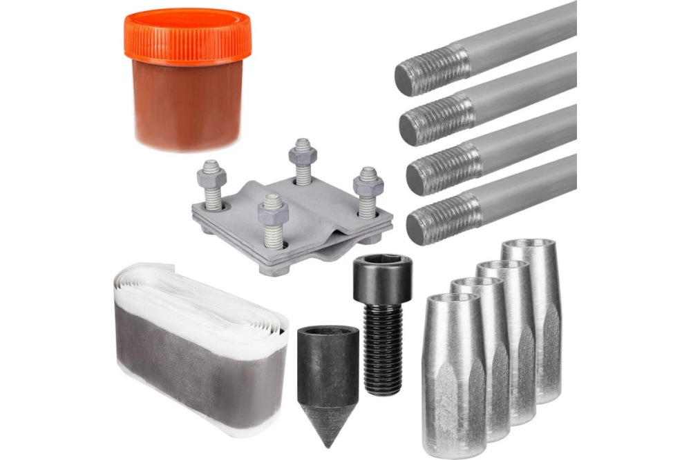- Комплектация: стержень заземления оцинкованный 16 мм х 1500 мм - 6 шт.|муфта соединительная, оцинк. - 6 шт.|наконечник - 1 шт.|зажим соединительный стержень — полоса/пруток, оцинк. - 1 шт.|головка удароприемная - 1 шт.|токопроводящая паста - 1 шт.|лента герметизирующая, 45 мм - 2 м