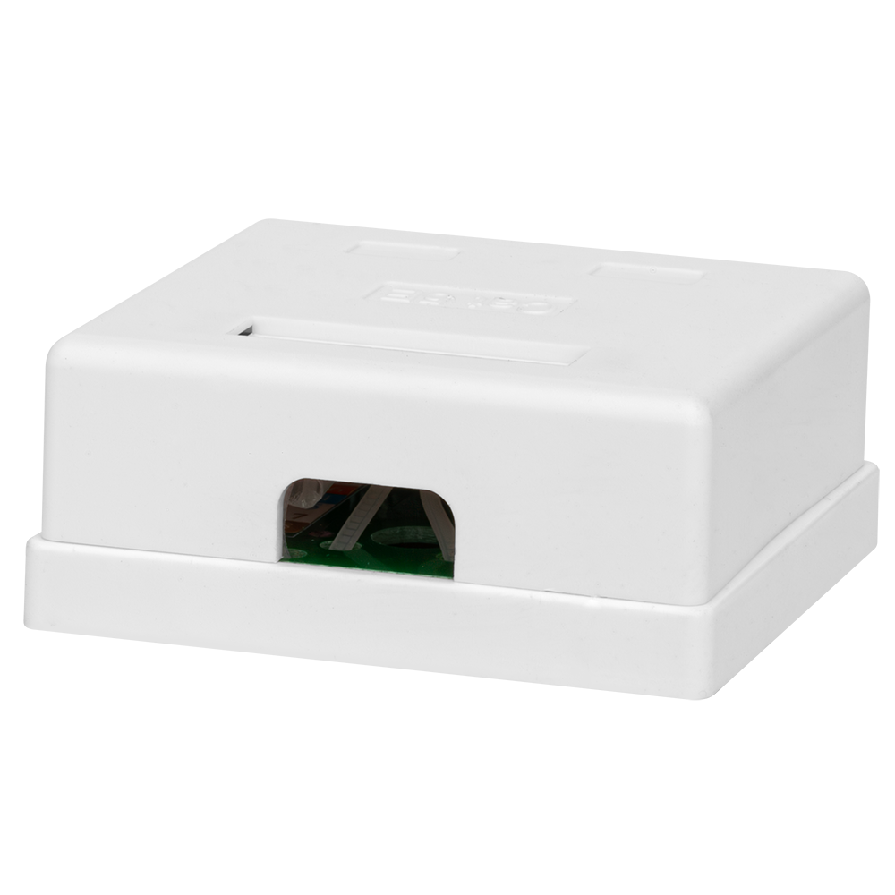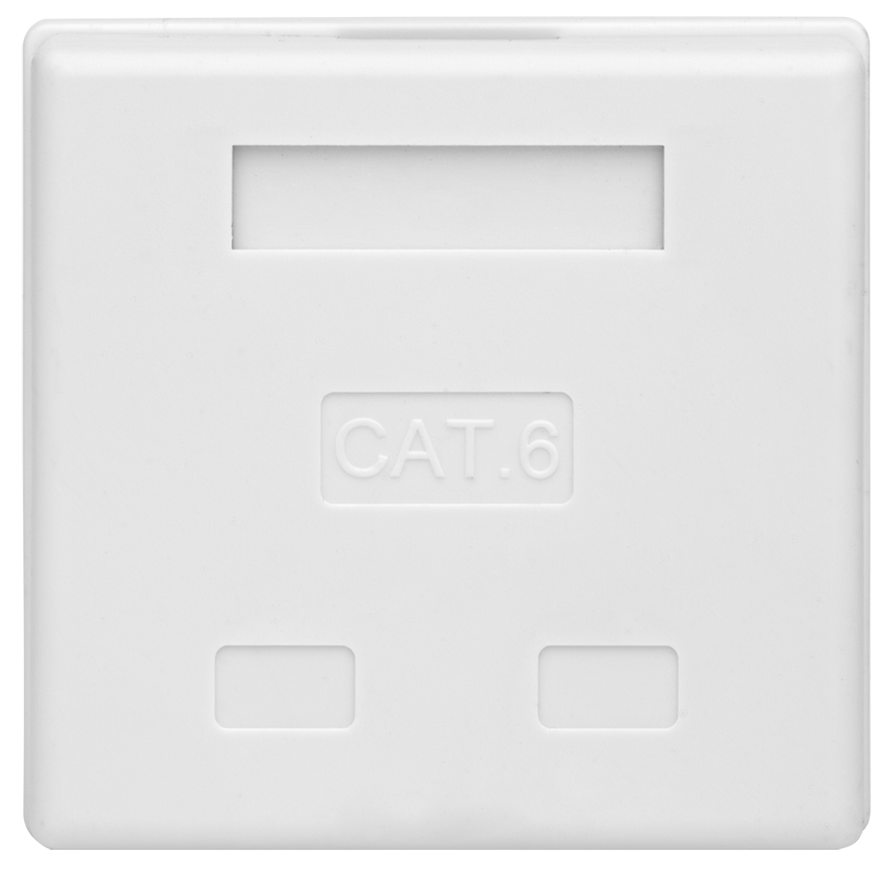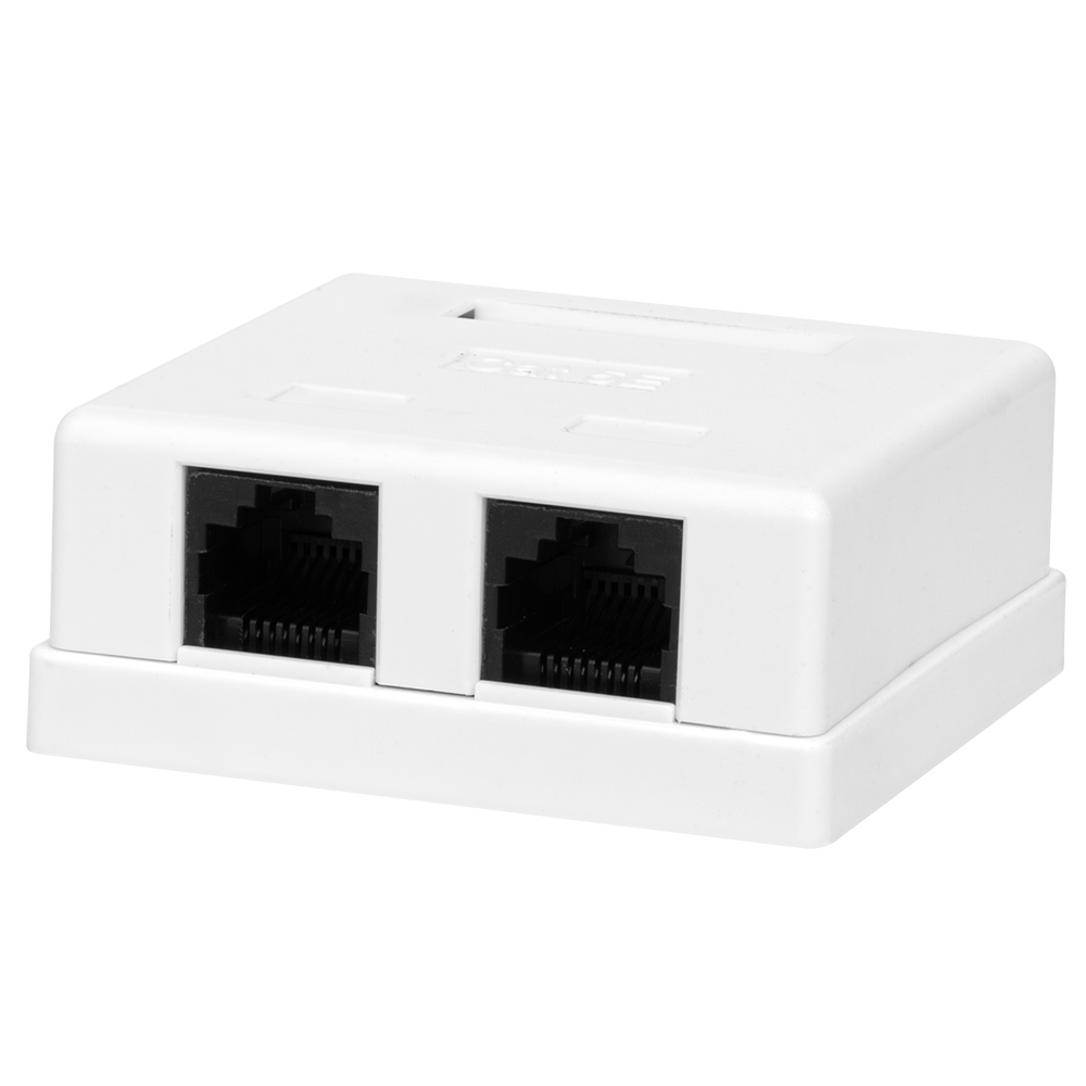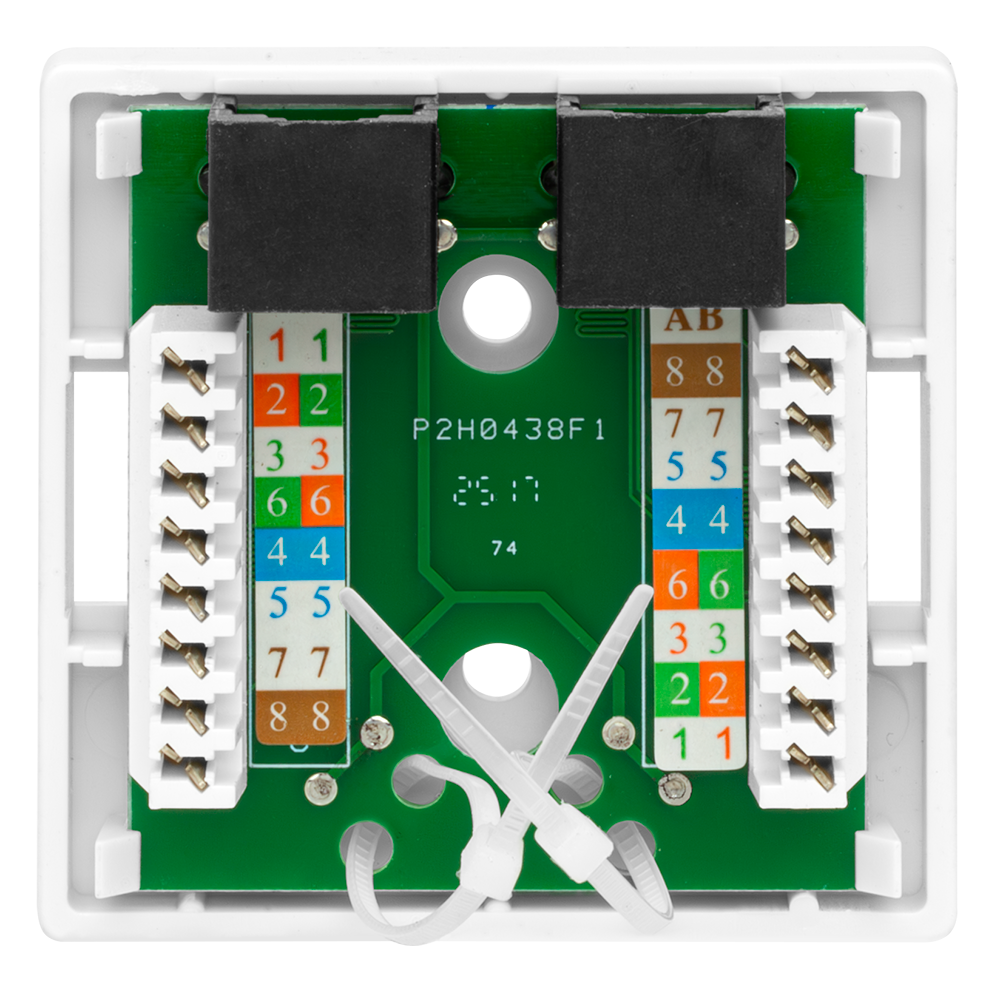 Неэкранированная компьютерная розетка настенного монтажа. Соответствует характеристикам категории 6. Имеет 2 порта RJ-45 (8р8с). На печатной плате установлены контакты типа Dual IDC с цветной маркировкой по двум стандартам - T568 А и B. Ножи контактов располагаются под 45°, что лучше сказывается на передаточных характеристиках разъема. Для заделки проводников подходят ножи тип 110 и Krone. В комплект розетки входит двусторонняя клеевая площадка, винты для крепления к стене и стяжки для фиксации кабелей в розетке