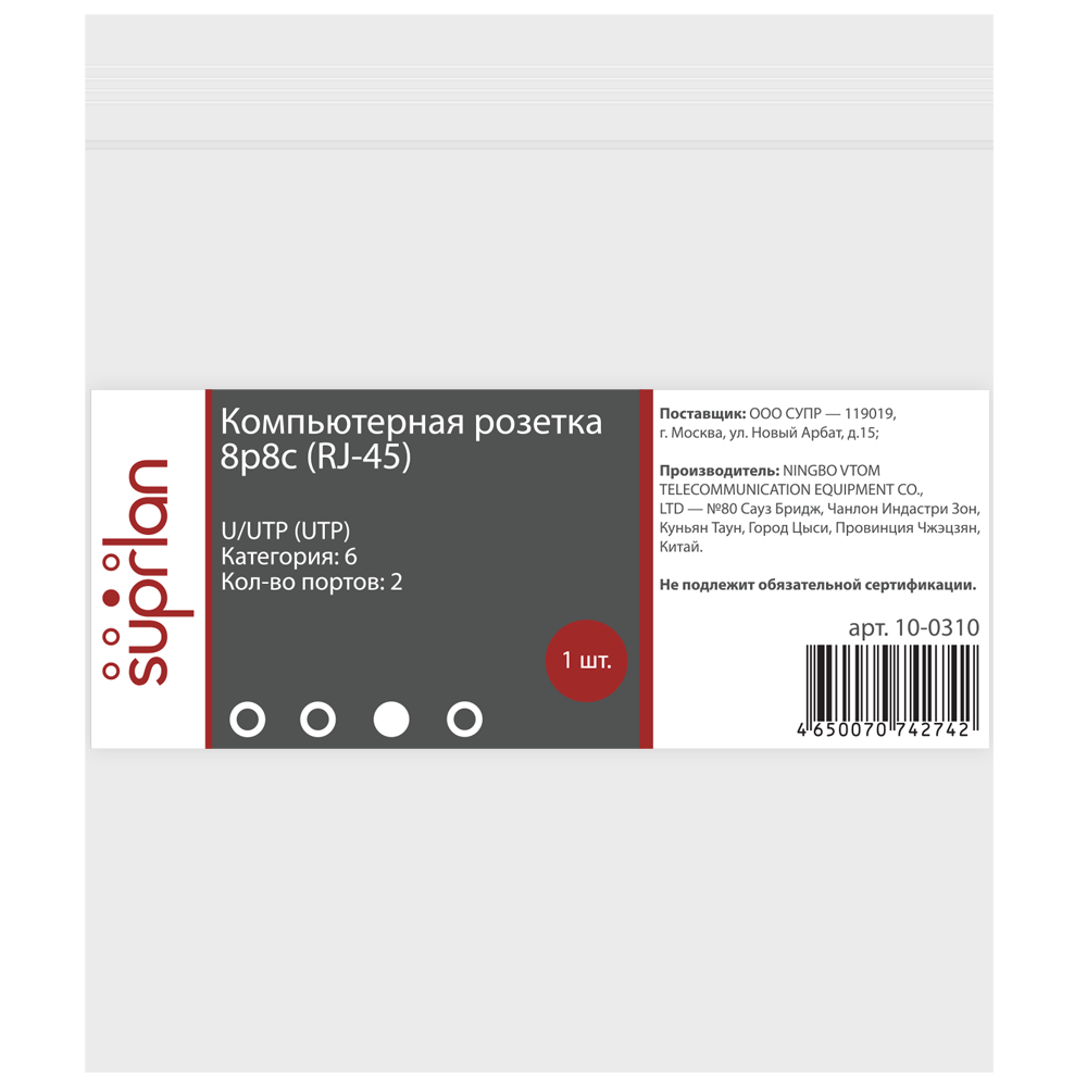 Полное описание товара Компьютерная розетка 8P8C (RJ-45), UTP, Cat.6, 2 порта (SUPRLAN) 10-0310