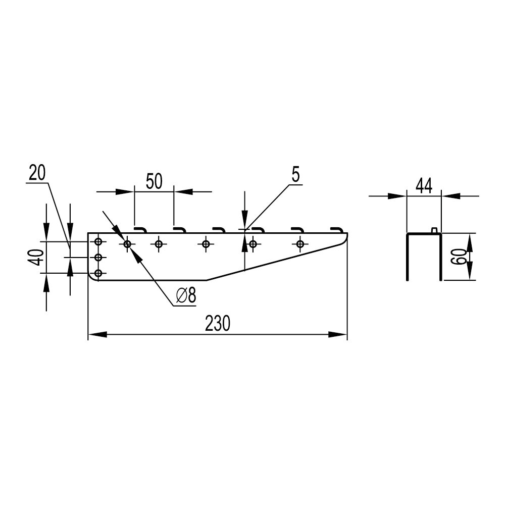 Консоль серии BM для проволочного лотка с шириной основания 200 мм. Предназначена для безвинтового монтажа кабельной трассы на основе системы проволочных лотков ‘‘F5 Combitech’‘ с максимально допустимой нагрузкой 250 кг. Крепление осуществляется к профилям PSM и PSL болтами М8х60 и гайками М8. Толщина стали - 1,5 мм.