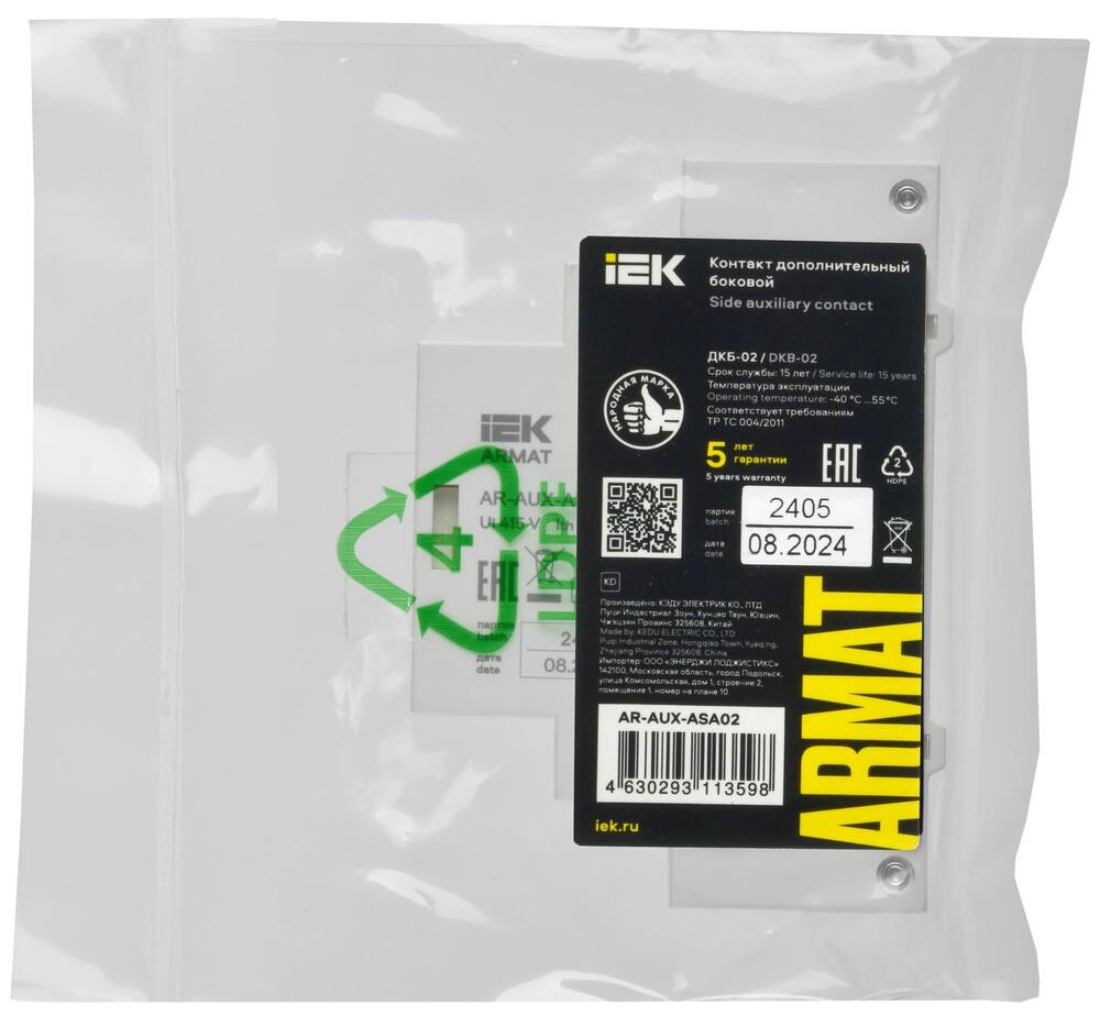 Дополнительный контакт для автоматического выключателя защиты двигателя серии ARMAT предназначен для коммутации цепей управления и сигнализации переменного тока при изменении коммутационного состояния главных контактов. Дополнительный контакт соответствует требованиям ТР ТС 004/2011.