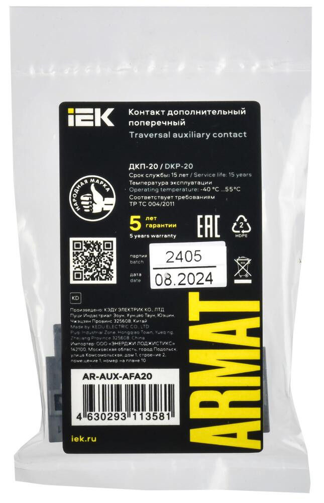 Дополнительный контакт для автоматического выключателя защиты двигателя серии ARMAT предназначен для коммутации цепей управления и сигнализации переменного тока при изменении коммутационного состояния главных контактов. Дополнительный контакт соответствует требованиям ТР ТС 004/2011.