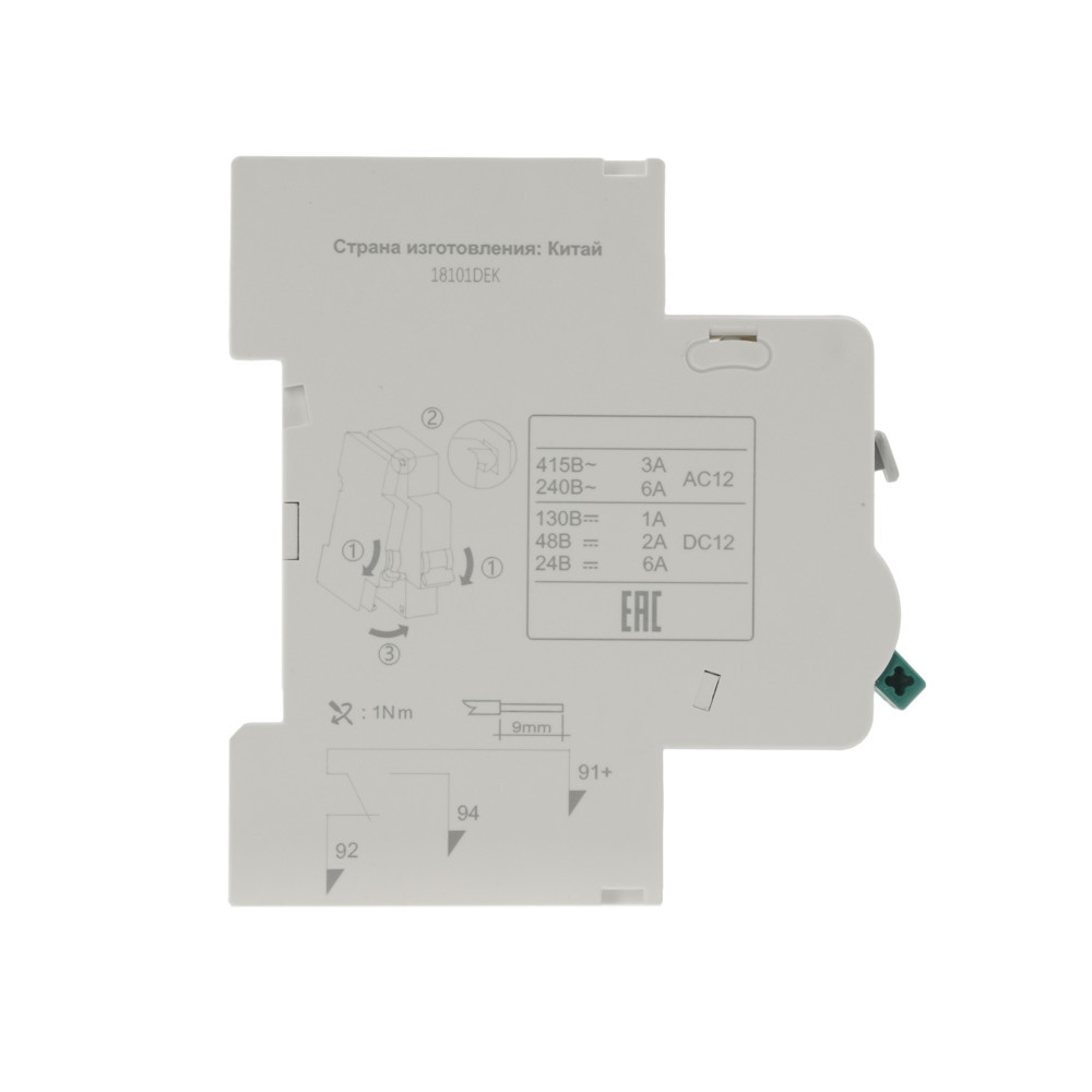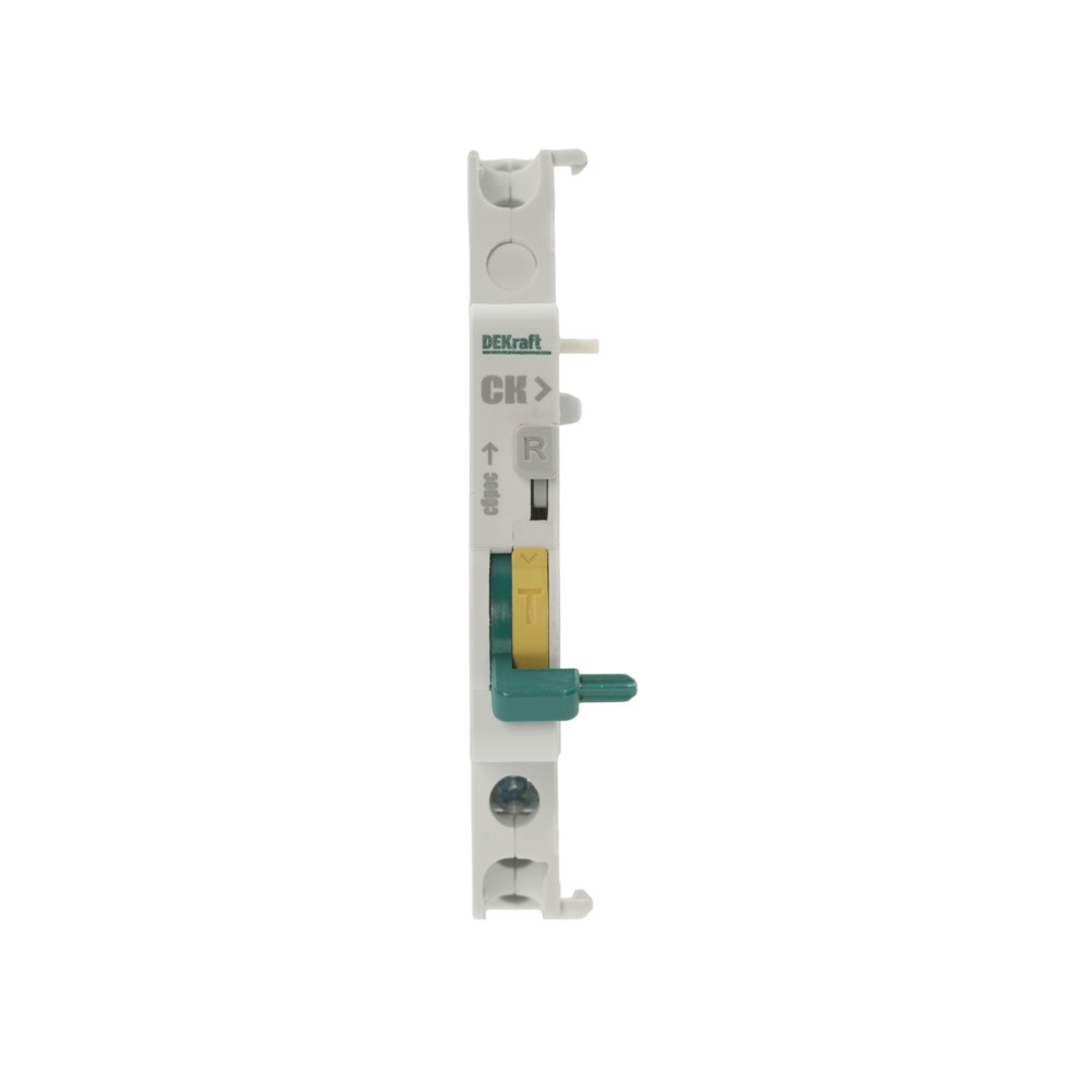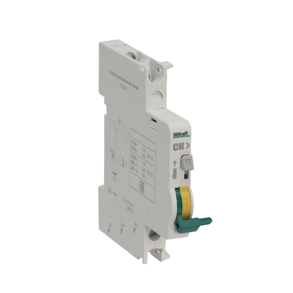 Контакт сигнальный СК-101 для автоматических выключателей серии ВА-101 DEKraft, предназначен для сигнализации аварийного срабатывания выключателя, тип контакта - переключающий, номинальный ток - 6 А, ном.напряжение - 220 В пер.тока, ширина - 9 мм, установка - на DIN-рейку, присоединение к выключателю слева. Контакты переходят в свое начальное состояние при возврате выключателя в исходное положение.