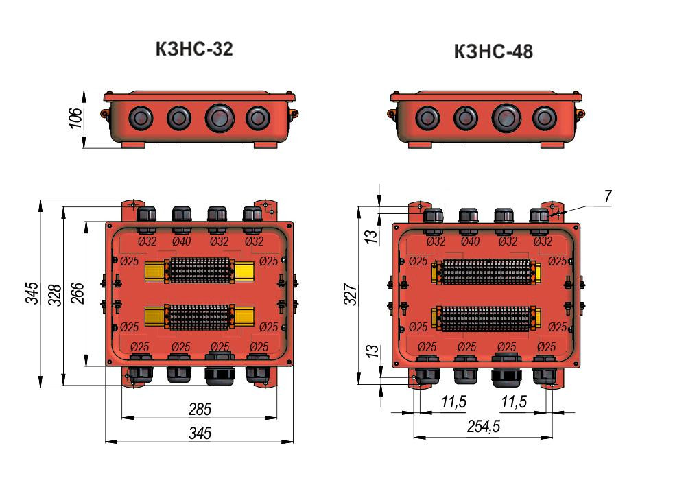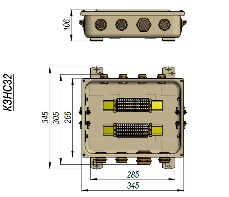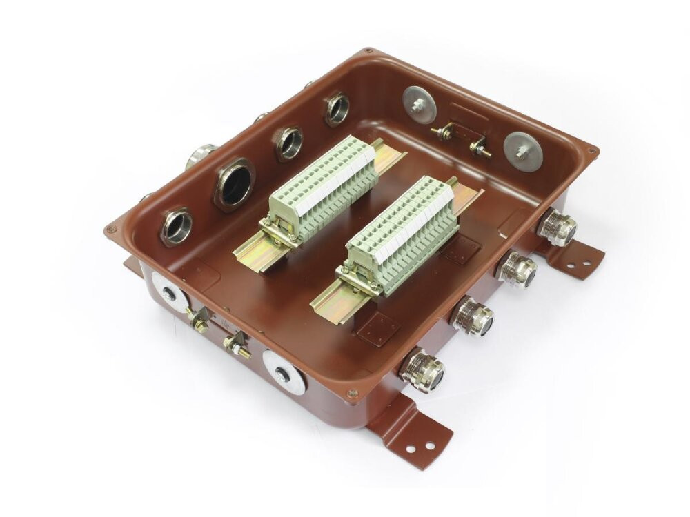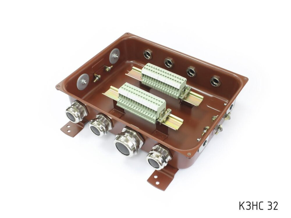 Коробки КЗНС-32 с наборными зажимами предназначены для соединения и разветвления силовых электрических цепей и цепей КИПиА, выполняемых контрольными и силовыми кабелями с алюминиевыми или медными жилами. Наличие запрессованной бобышки, невыпадающие из крышки винты и уплотнитель оптимальной жесткости позволяют многократно откручивать и прикручивать крышку без изменения степени защиты коробки по IP. Степень защиты коробок с латунными кабельными вводами и металлическими заглушками IP65 по ГОСТ 14254-2015. С пластиковыми кабельными вводами IP54 по ГОСТ 14254-2015. Коробка распределительная металлическая на наружной поверхности имеет ушки, предназначенные для их крепления к строительным конструкциям с помощью стандартных крепежных изделий или сварки. Имеют 4 дополнительных отверстия 25мм для установки кабельных вводов (привертных сальников). Отверстия закрыты металлическими заглушками, которые при необходимости снимают.