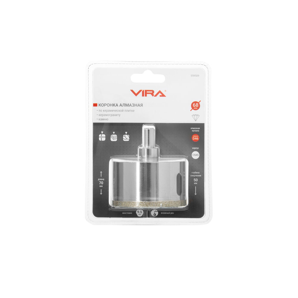 Полное описание товара Коронка алмазная 68 мм по керамограниту, керамике и стеклу с центровочным сверлом (Vira) 559509