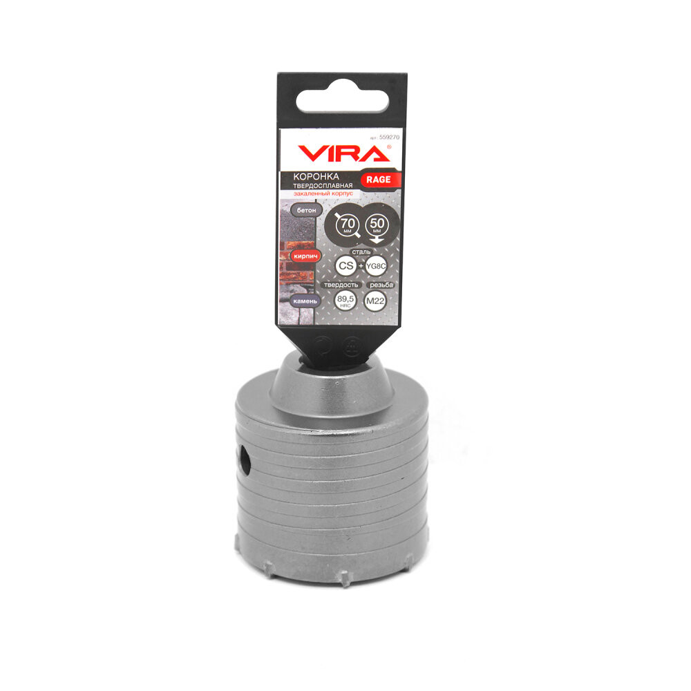 Коронка RAGE by VIRA предназначена для сверления отверстий в бетоне, кирпичной кладке, силикатном кирпиче газобетоне и других видах бетона с классом прочности не более В55. Не применима для сверления армированного бетона. Используется с адаптерами М22 шаг резьбы 2мм . Тело коронки выполнено из стали CS, зубчики из твёрдого победитового сплава YG8С. Глубина сверления - 50 мм.