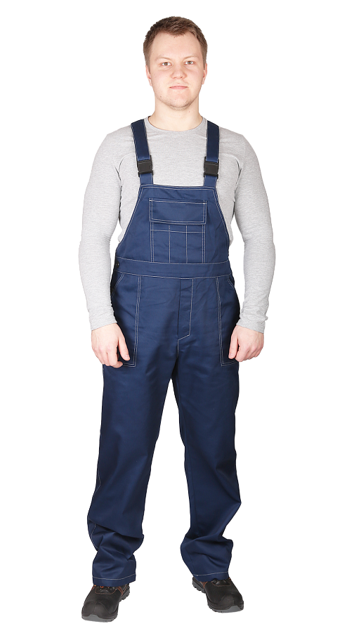 Полукомбинезон с притачным поясом и шлёвками для ремня, имеет два боковых накладных кармана с косым входом.