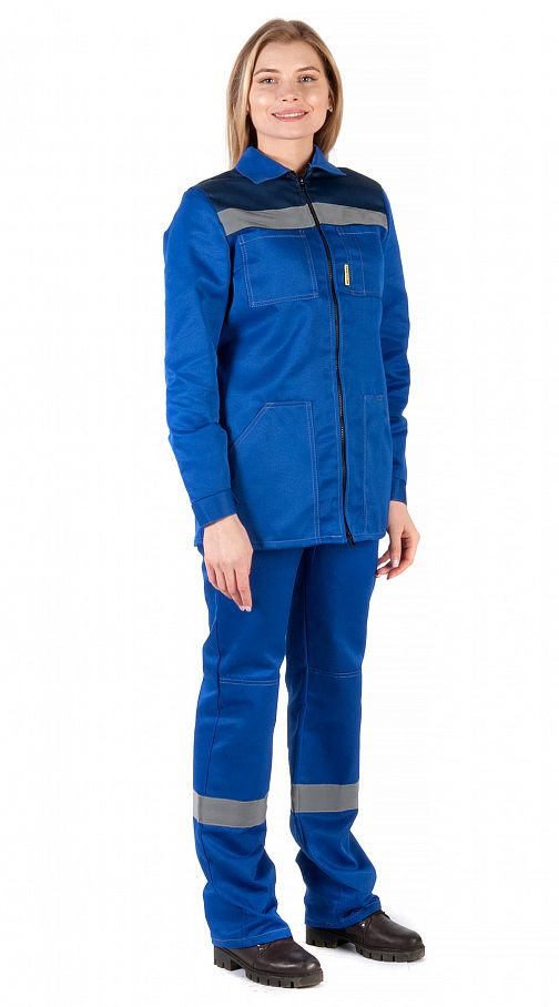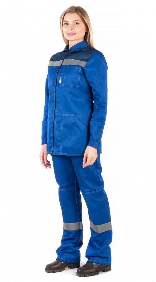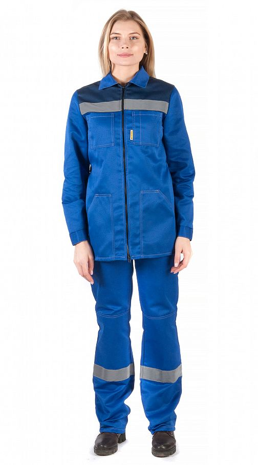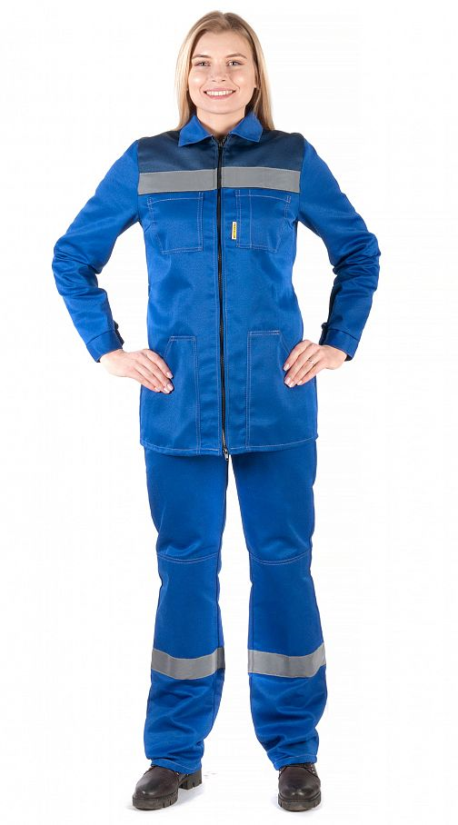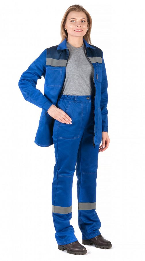 Костюм женский "Чикаго" с брюками (василек/т.синий) PENTALAB изготовлен из гармонирующих тканей двух цветов – василькового и тёмно-синего. На уровне груди спереди и сзади, и по низу брюк вшиты светоотражающие полосы шириной 50 мм.