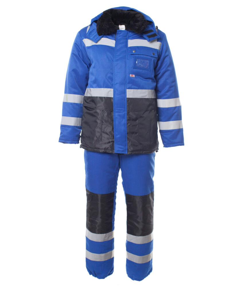 Костюм с вставками и усилительными накладками из водоотталкивающей ткани, усиленный пакет утеплителя, ветрозащитная прокладка под тканью верха, нагрудный карман с окном под бейдж, нижними накладными карманами и внутренним карманом на подкладке, центральная застежка куртки на молнию, закрытую ветрозащитной планкой на липучку, съёмный капюшон с регулировкой объёма по лицевой части,и возможность использования капюшона на каску, меховой воротник, регулировка ширины изделия по талии и низу куртки, трикотажные манжеты по низу рукавов и низу полукомбинезона подкладки, накладные карманы на передних половинках п-к, усилительные накладки в области колен из водоотталкивающей ткани, в костюме используется световозвращающия лента.