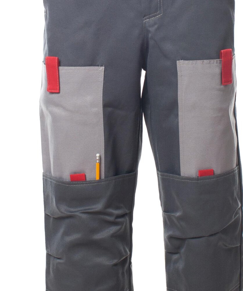 Накладной нагрудный карман с делением под ручку. Накладной карман с полуобъемом и клапаном застегивающимся на липучку, нижние карманы в рельефе. Усилительные накладки в области локтей. Усилительные накладки в области колен для амортизационных вкладышей. Укороченная куртка на поясе с регулировкой низа куртки хлястиками на липучке. Полукомбинезон с многофункциональными карманами. Застежка гульфика и в правом боковом шве на молнию. Эластичная резинка по талии спинки. Бретели на пластиковых застежках (фастексах), регулирующиеся по длине эластичной резинки.