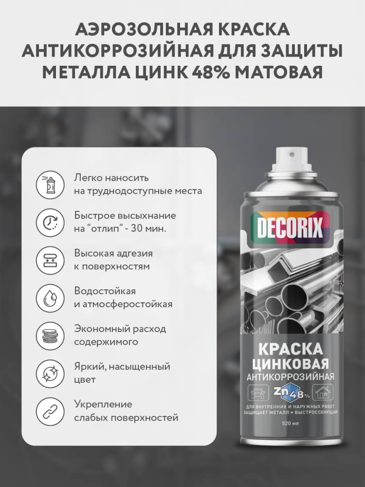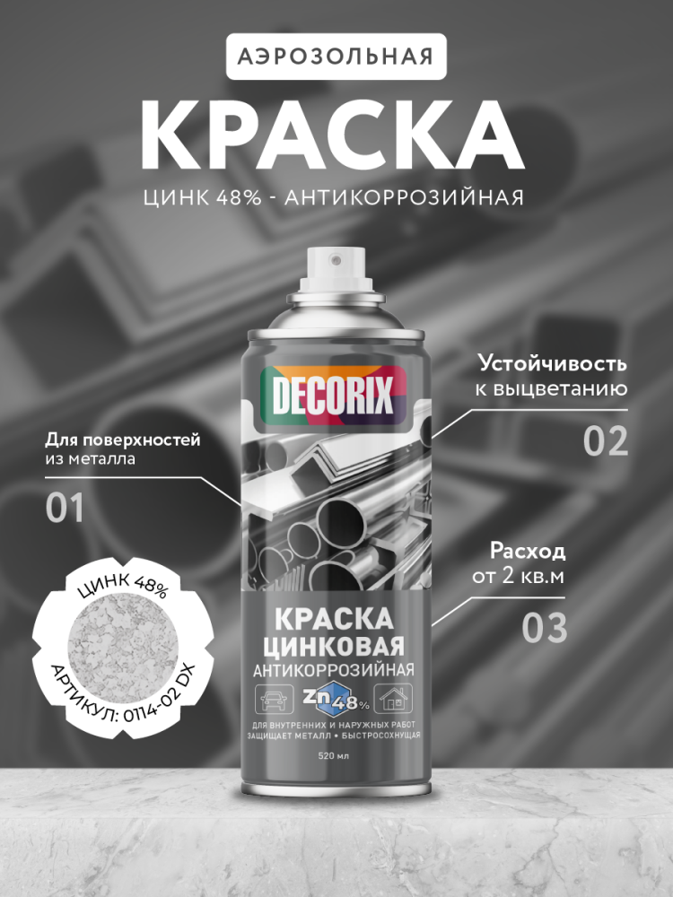 Полное описание товара Краска аэрозольная антикоррозийная для защиты металла цинк 48% 520 мл (DECORIX) 0114-02 DX