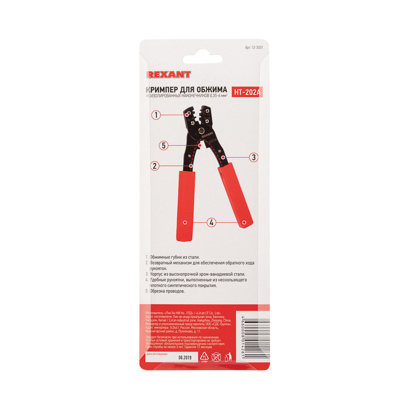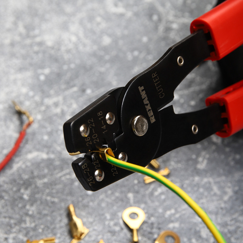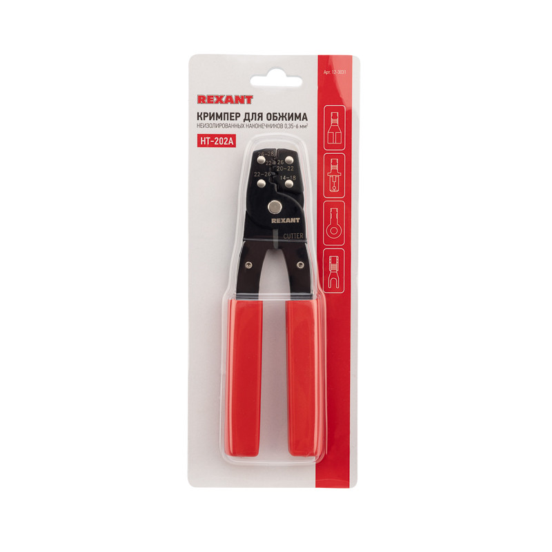 Кримпер для обжима ht-202A REXANT. Обжим неизолированных и изолированных клемм 0.35-6.0 мм2. Возвратный механизм для обеспечения обратного хода рукояток. Режущая кромка для равномерной обрезки проводников. Цельнометаллическая конструкция жесткого типа. Рукоятки выполнены из нескользящего плотного синтетического покрытия.