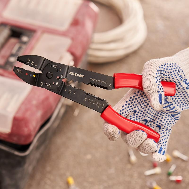 Кримпер REXANT HT-204 — универсальный инструмент, объединяющий в себе функции обжимного инструмента, винтореза и стриппера. Корпус выполнен из прочной закаленной стали. Обрезка проводов, обжим изолированных наконечников с 3 типоразмерами 1.25, 2.0, 5.5 мм2 (профиль обжима овальный одноконтурный), обрезка винтов с 5 типоразмерами (М2.6, М3, М5, М4, М3,5), обжим неизолированных наконечников с 3 типоразмерами 1.25, 2.0, 5.5 мм2. (профиль обжима клиновидный), снятия изоляции (зачистка) с проводов с 6 типоразмерами - 0.75, 0.9, 1.25, 2.0, 3.5, 5.5 мм2. Эргономичные рукоятки покрыты специальным материалом, который исключает скольжение ладоней.