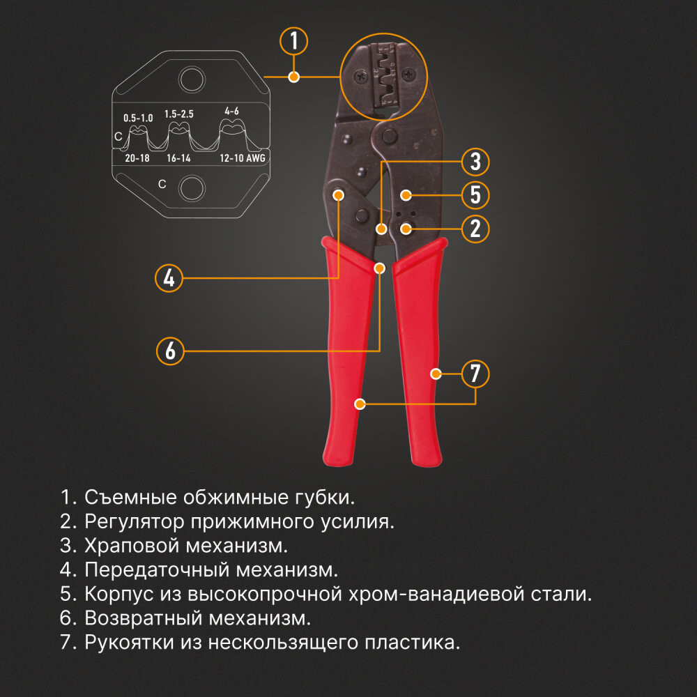 - Преимущества: Возвратный механизм упрощает работу и снижает утомляемость|Нескользящие рукоятки для удобного захвата инструмента|Кримпер изготовлен из закаленной инструментальной стали с воронением|Двухконтурная матрица – обжим как по изоляции, так и по жиле|Регулятор прижимного усилия матриц для качественной опрессовки|Специальный передаточный механизм уменьшает нагрузку на руку при сведении рукояток|Храповой механизм предотвращает преждевременное разжатие ручек и производит качественную опрессовку|Обжимные губки изготовлены микролитьем и гарантирует точное соответствие размеру и форме клемм и контактов|Съемные обжимные губки могут быть заменены на губки с другими сечениями.