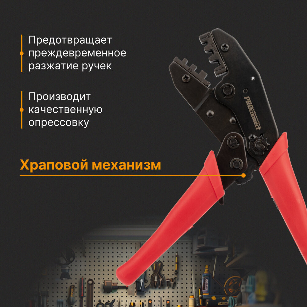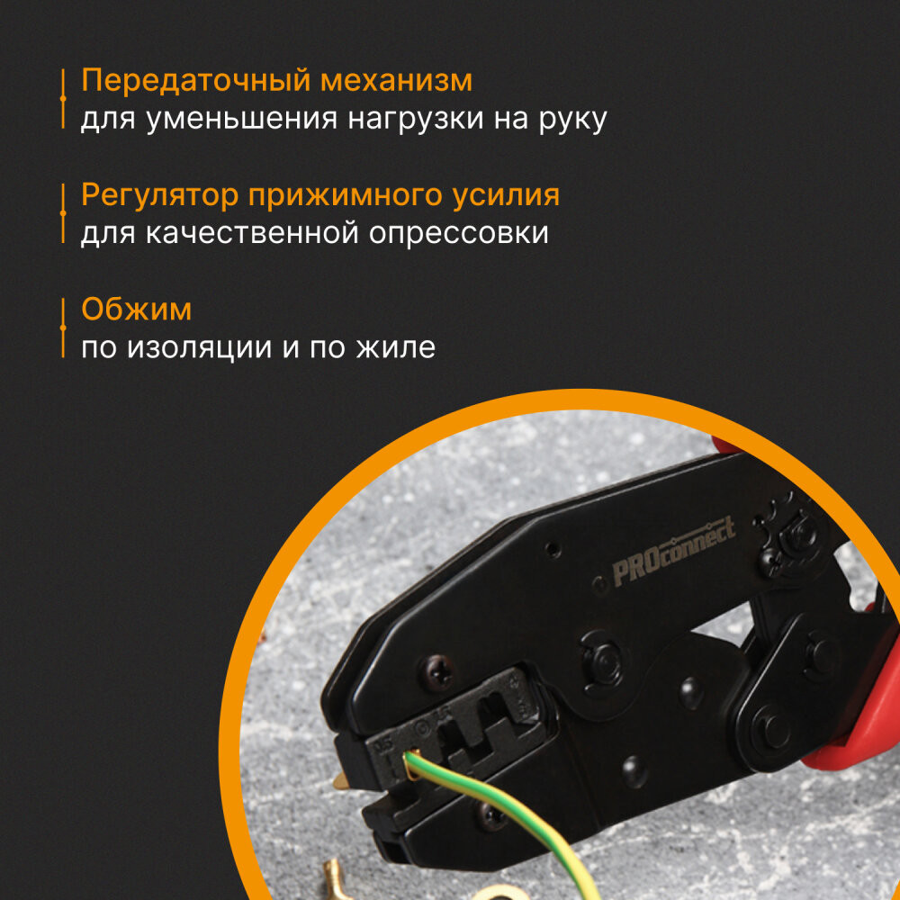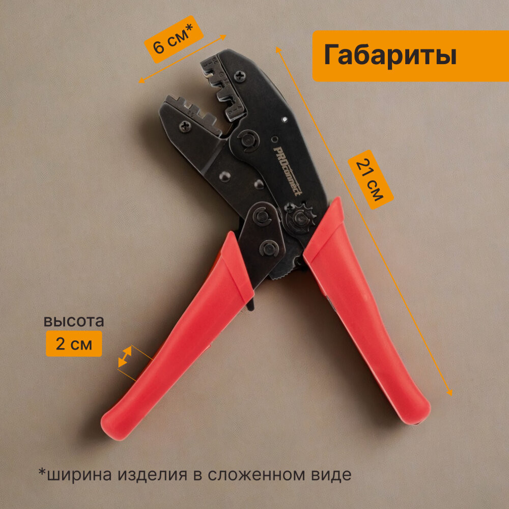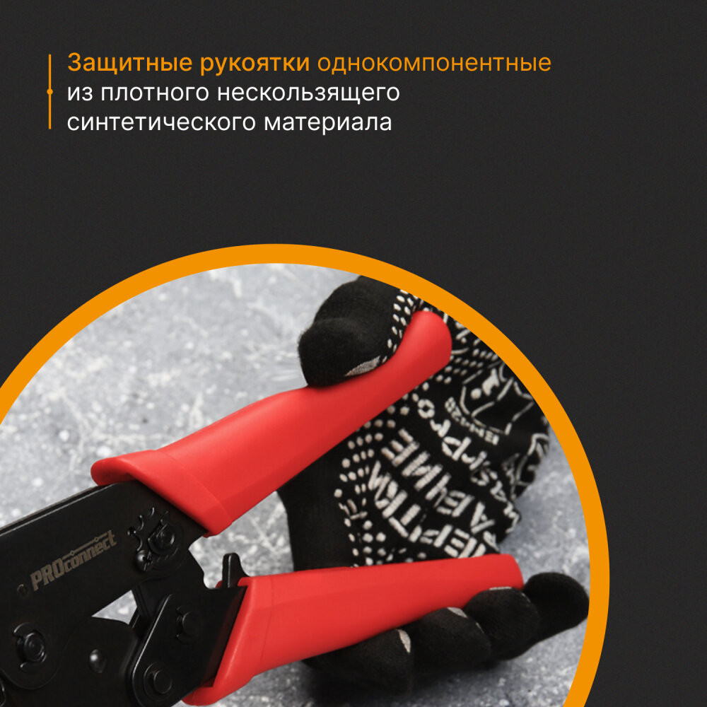 Кримпер PROconnect HT-236C – универсальный инструмент для обжима неизолированных клемм с диапазоном 0.5-6.0 мм2. Корпус выполнен из высокопрочной закаленной инструментальной стали с воронением. Двухконтурная матрица позволяет совершать обжим как по изоляции, так и по жиле. Регулятор позволяет контролировать прижимное усилие матриц. Храповой механизм гарантирует полный цикл качественной опрессовки. Съемные обжимные губки из стали, изготовленные микролитьем. Специальный передаточный механизм уменьшает нагрузку на руку при сжатии. Возвратный механизм для обеспечения обратного хода рукояток. Эргономичные рукоятки покрыты нескользящим резиновым покрытием, что сделает работу с инструментом легкой и приятной.