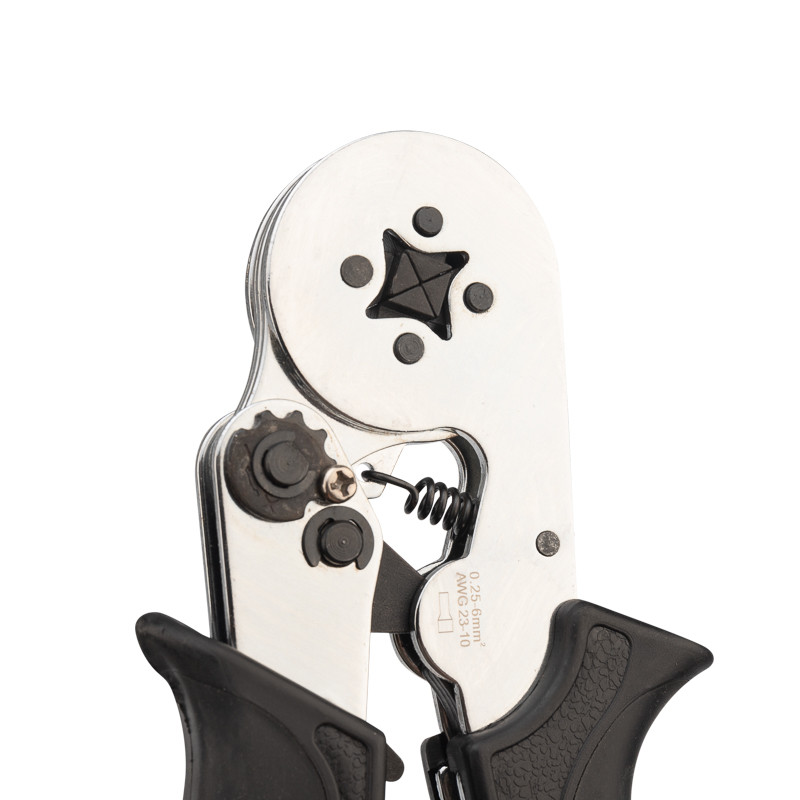 - Преимущества: Длительный срок службы – кримпер выполнен из высокопрочной стали с хромированием|Регулятор прижимного усилия с 4-мя положениями обеспечивает надежный обжим без риска повредить проводник|Четырехсегментная матрица равномерно распределяет давление и обеспечивает качественный обжим|Возвратный механизм упрощает работу и снижает утомляемость|Храповой механизм предотвращает преждевременное разжатие ручек и производит качественную опрессовку|Нескользящие рукоятки для удобного захвата инструмента