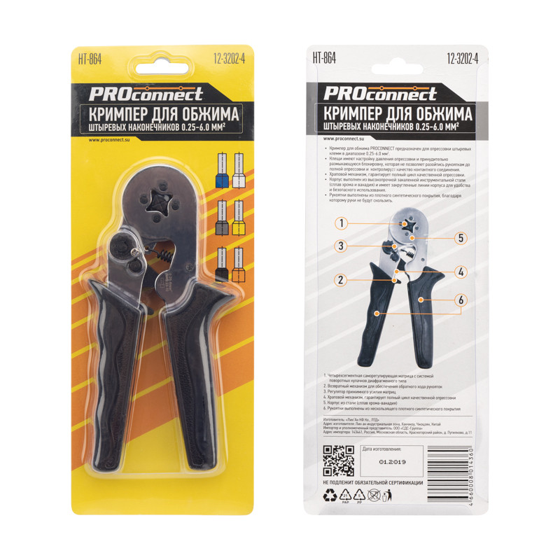 Полное описание товара Кримпер HT-864 для обжима штыревых наконечников 0,25-6 мм2 (ProConnect) 12-3202-4