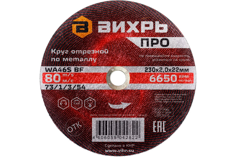 Полное описание товара Круг отрезной по металлу ПРО 230х2,0х22 мм (Вихрь) 73/1/3/54