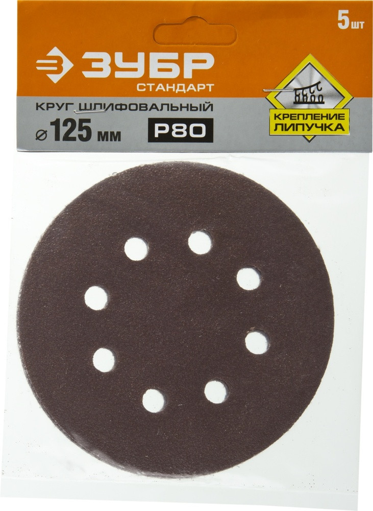 Круг шлифовальный ''СТАНДАРТ'' из абразивной бумаги на велкро основе, 8 отв., Р80, 125мм, 5шт (ЗУБР) 35350-125-080