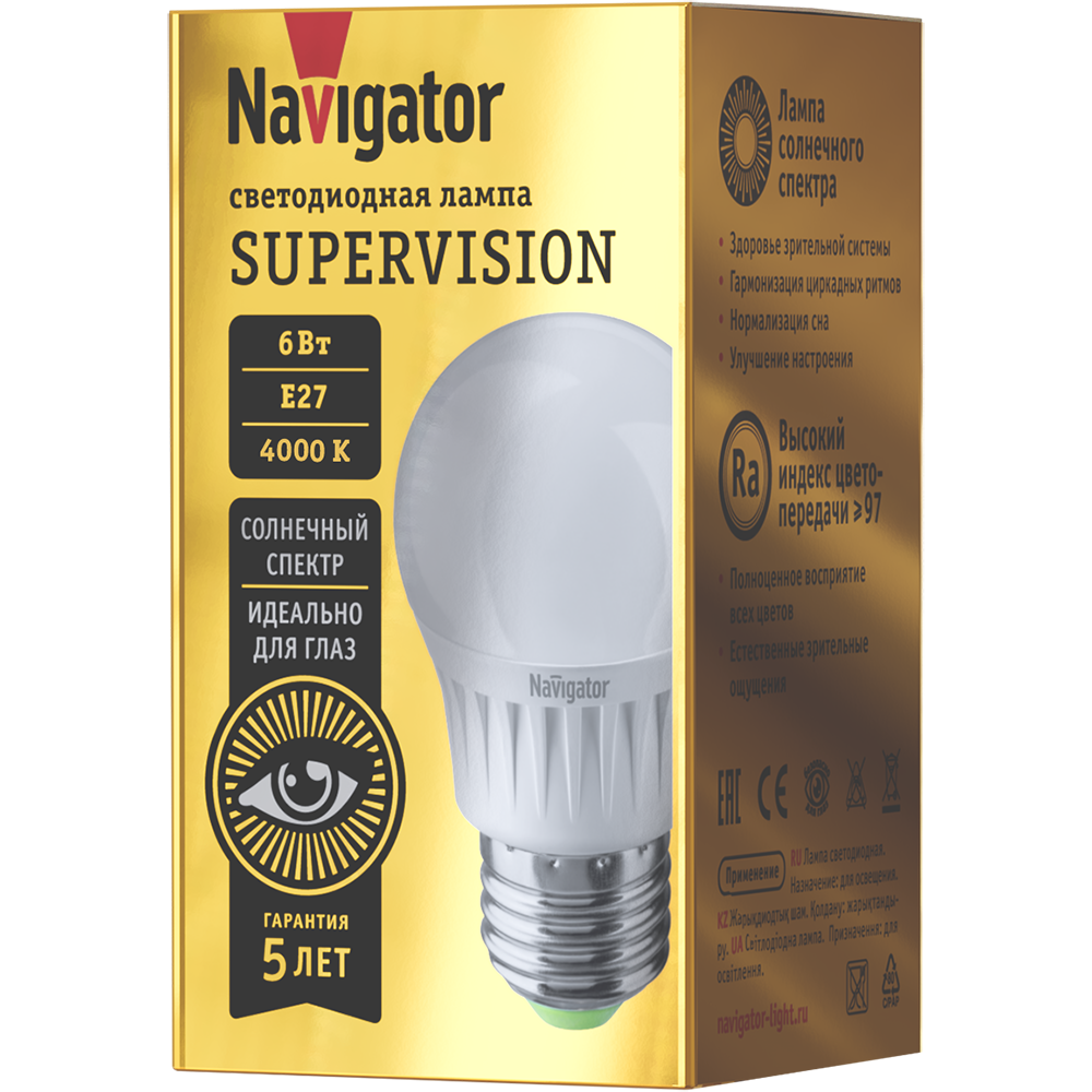 Navigator Supervision – светодиодные лампы нового поколения, в которых используются инновационные светодиоды Bridgelux Thrive (США) со спектром света, максимально приближенным к солнечному! Светодиодные лампы Navigator Supervision полностью безопасны для глаз и обеспечивают максимально комфортное освещение для работы и отдыха. Равномерный спектр света без пиков в области синего цвета и провалов в области сине-бирюзового и красного цветов гарантирует здоровье зрительной системы и гармонизацию биоритмов - улучшение качества сна и поддержку гормональной системы. Индекс цветопередачи ?97 обеспечивает физиологичные зрительные ощущения без дискомфорта и полноценное восприятие цветов и оттенков.