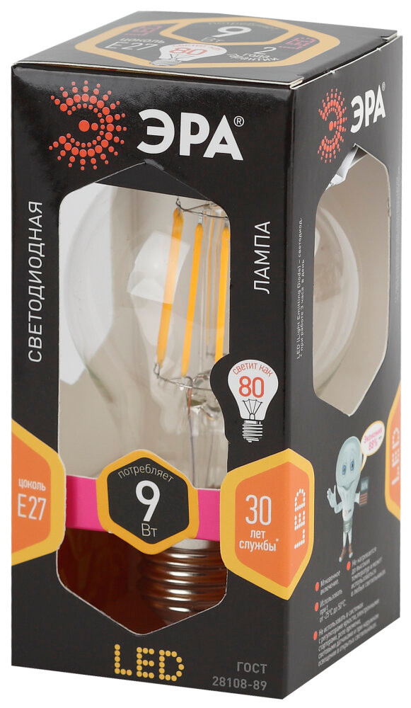 Полное описание товара Лампа светодиодная декоративная LED 9 Вт 1170Лм 2700К груша, филамент теплый E27 230В F-LED A60-9W-827-E27 (ЭРА) Б0043433