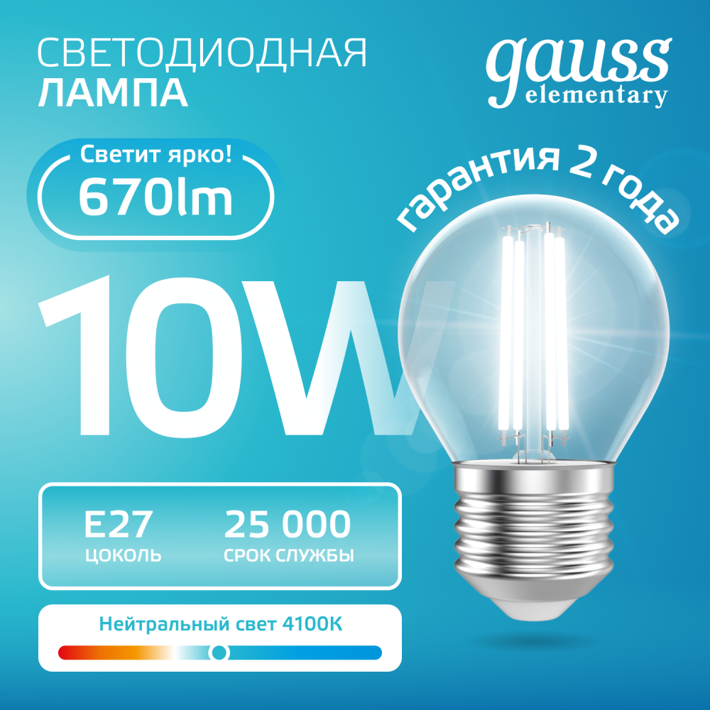 Полное описание товара Лампа светодиодная филаментная LED 10 Вт 670 лм 4100К шар P45 нейтральный E27 AC 220В прозрачная колба Elementary (GAUSS) 52220