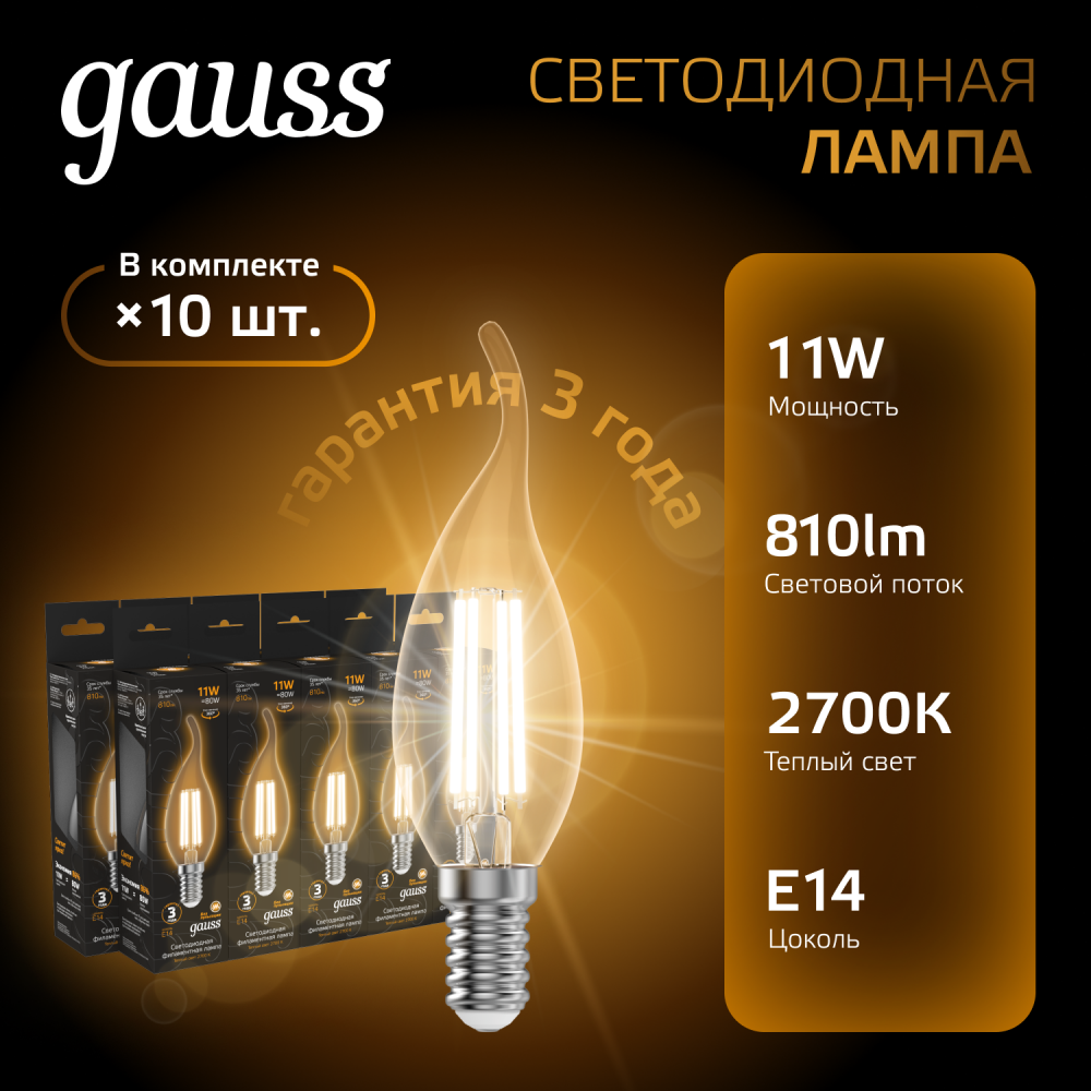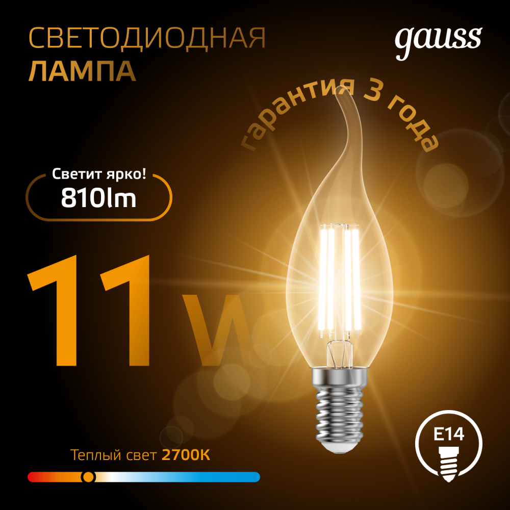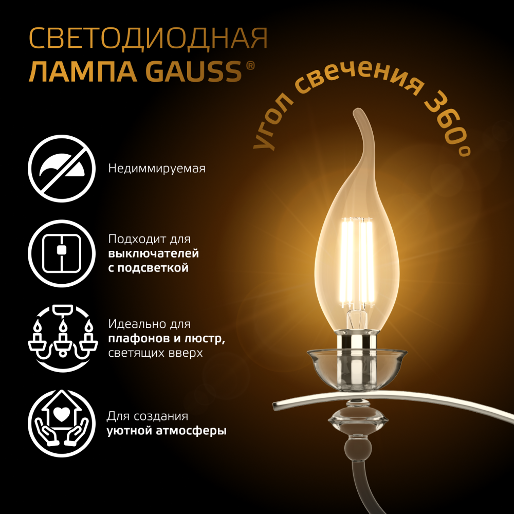 Светодиодные филаментные лампы GAUSS - это новейшие технологии в светотехнике. Лампы имеют привычный вид классических ламп накаливания, освещают пространство на 360 градусов и дают больше света по сравнению с обычными светодиодными лампами за счет прозрачной колбы. Идеально подходят для хрустальных люстр и открытых светильников, а также для реализации дизайнерских решений, где важен вид классических ламп накаливания.