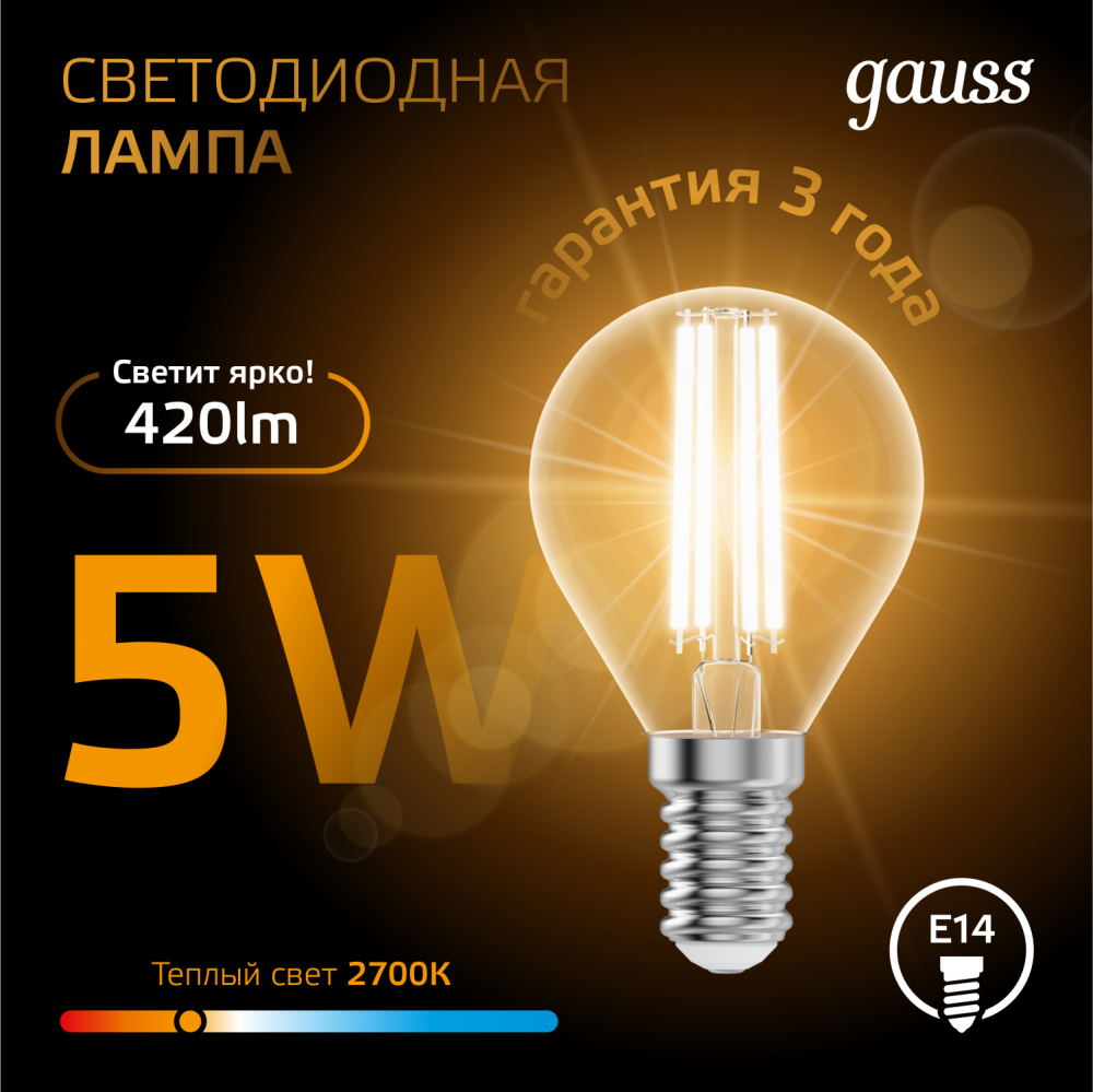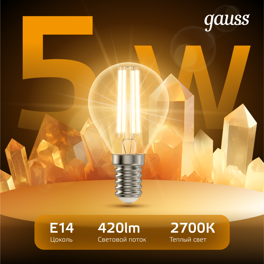 Светодиодные филаментные лампы GAUSS - это новейшие технологии в светотехнике. Лампы имеют привычный вид классических ламп накаливания, освещают пространство на 360 градусов и дают больше света по сравнению с обычными светодиодными лампами за счет прозрачной колбы. Идеально подходят для хрустальных люстр и открытых светильников, а также для реализации дизайнерских решений, где важен вид классических ламп накаливания.