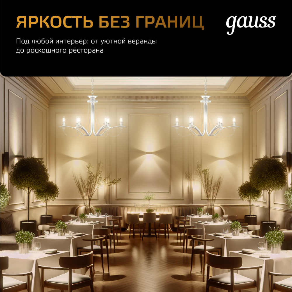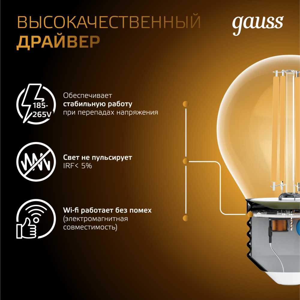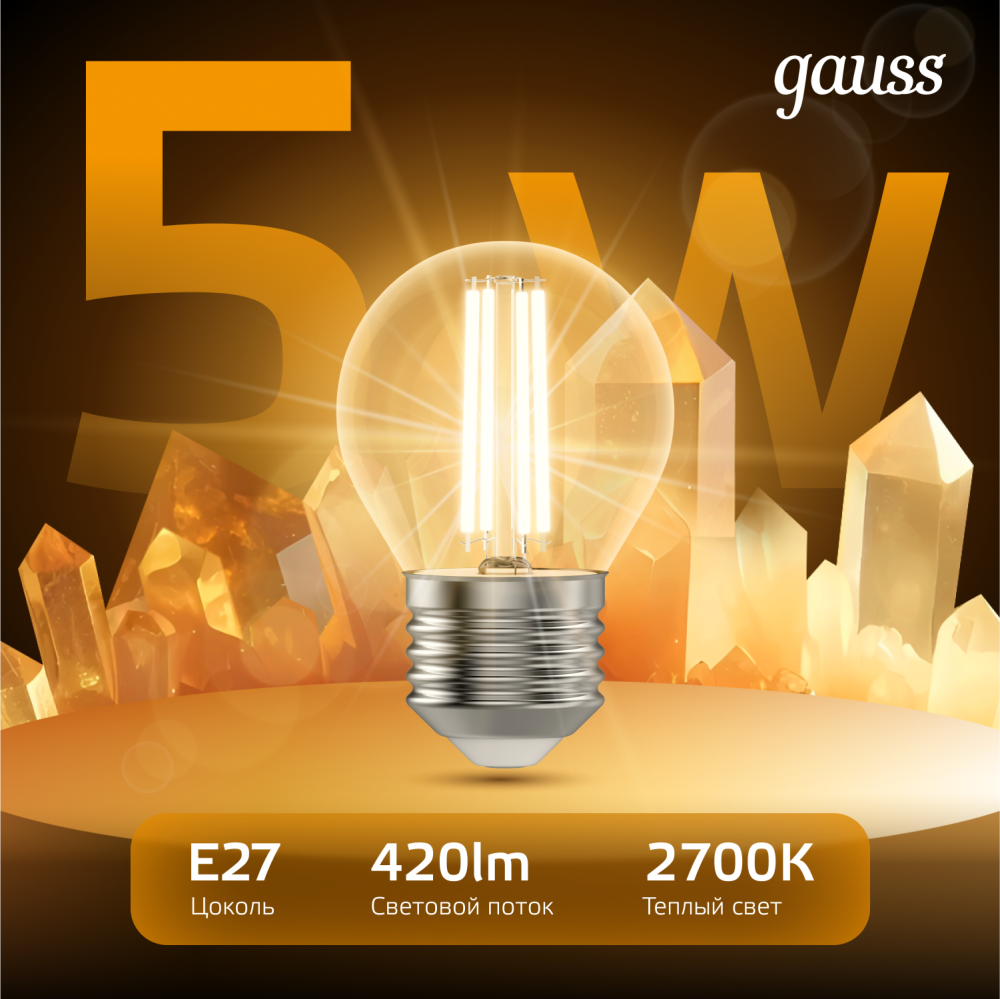 Светодиодные филаментные лампы GAUSS - это новейшие технологии в светотехнике. Лампы имеют привычный вид классических ламп накаливания, освещают пространство на 360 градусов и дают больше света по сравнению с обычными светодиодными лампами за счет прозрачной колбы. Идеально подходят для хрустальных люстр и открытых светильников, а также для реализации дизайнерских решений, где важен вид классических ламп накаливания.