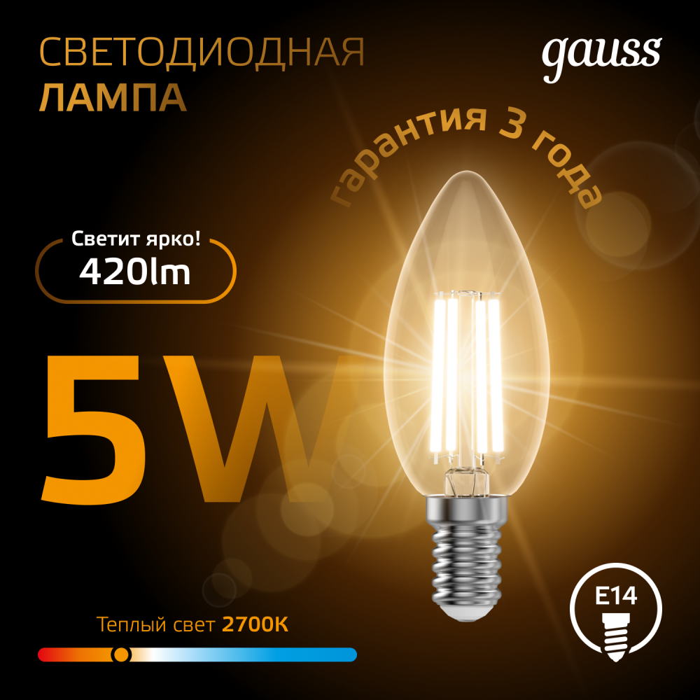 Светодиодные филаментные лампы GAUSS - это новейшие технологии в светотехнике. Лампы имеют привычный вид классических ламп накаливания, освещают пространство на 360 градусов и дают больше света по сравнению с обычными светодиодными лампами за счет прозрачной колбы. Идеально подходят для хрустальных люстр и открытых светильников, а также для реализации дизайнерских решений, где важен вид классических ламп накаливания.