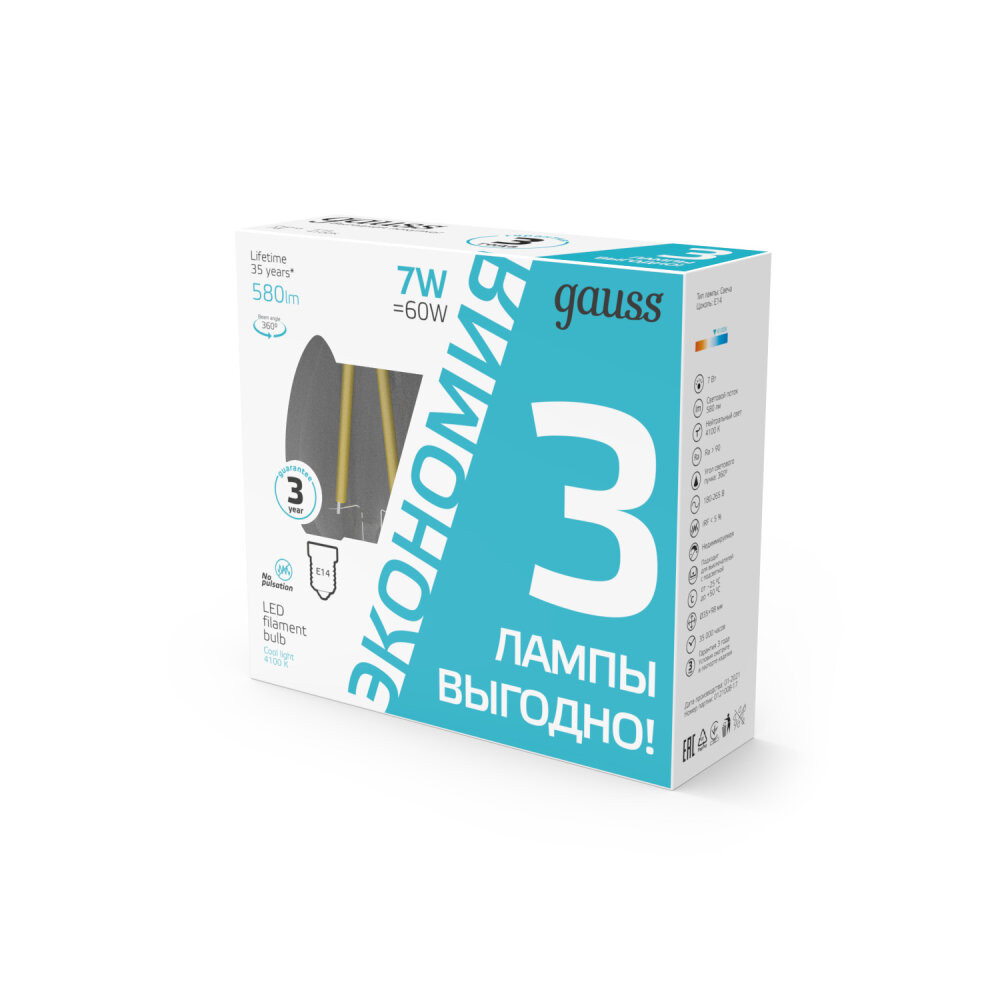 Светодиодные филаментные лампы GAUSS - это новейшие технологии в светотехнике. Лампы имеют привычный вид классических ламп накаливания, освещают пространство на 360 градусов и дают больше света по сравнению с обычными светодиодными лампами за счет прозрачной колбы. Идеально подходят для хрустальных люстр и открытых светильников, а также для реализации дизайнерских решений, где важен вид классических ламп накаливания.
