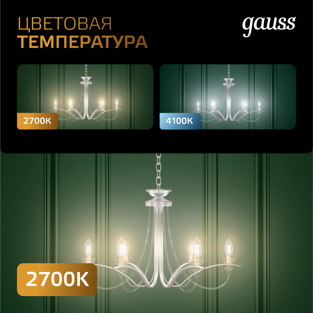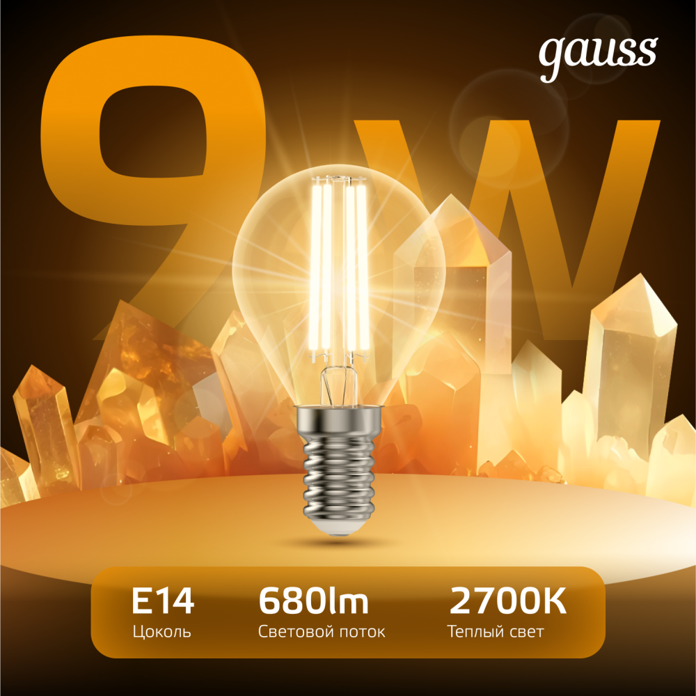 Светодиодные филаментные лампы GAUSS - это новейшие технологии в светотехнике. Лампы имеют привычный вид классических ламп накаливания, освещают пространство на 360 градусов и дают больше света по сравнению с обычными светодиодными лампами за счет прозрачной колбы. Идеально подходят для хрустальных люстр и открытых светильников, а также для реализации дизайнерских решений, где важен вид классических ламп накаливания.