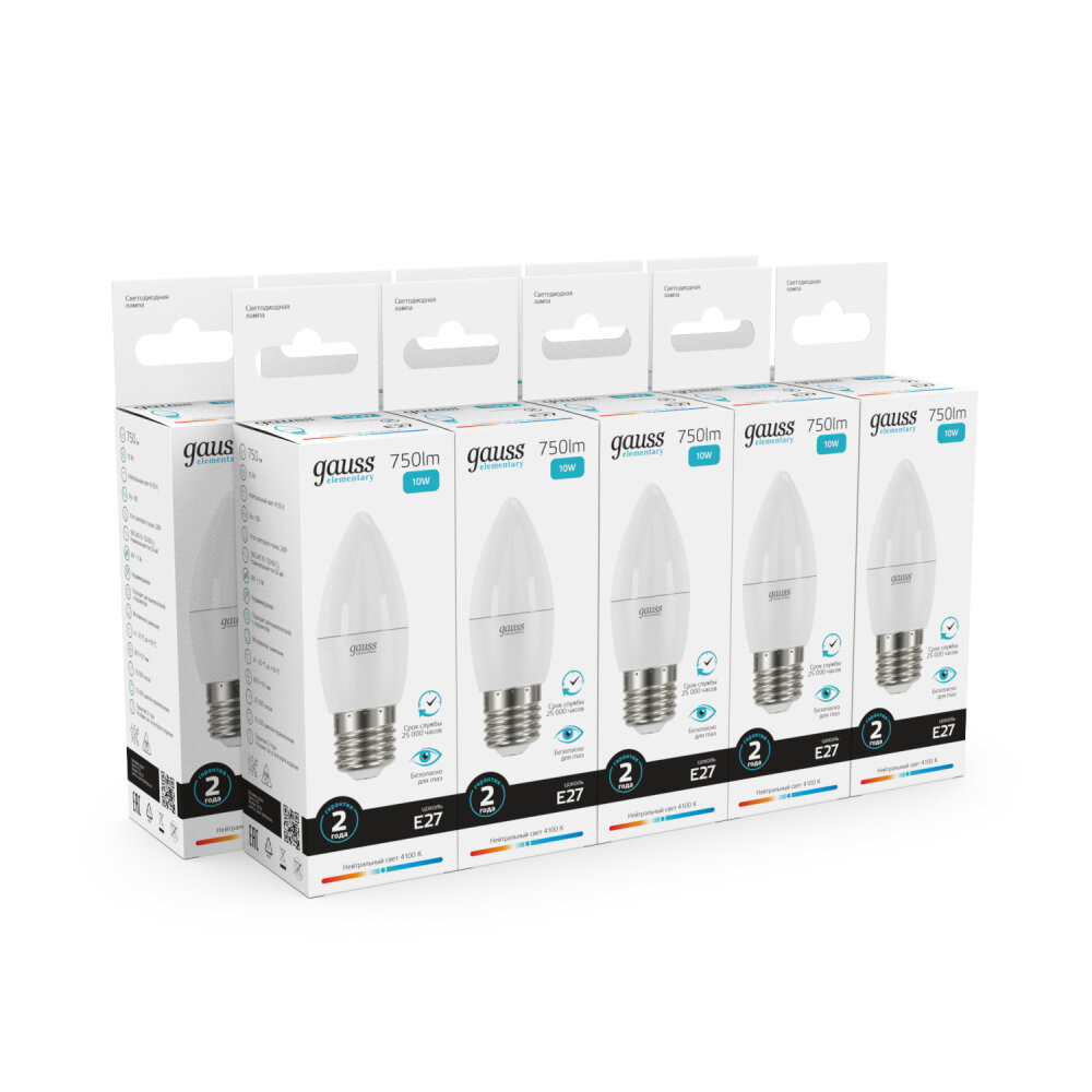 Полное описание товара Лампа светодиодная LED 10 Вт 750 лм 4100К свеча нейтральный E27 AC 220В Elementary (GAUSS) 30220