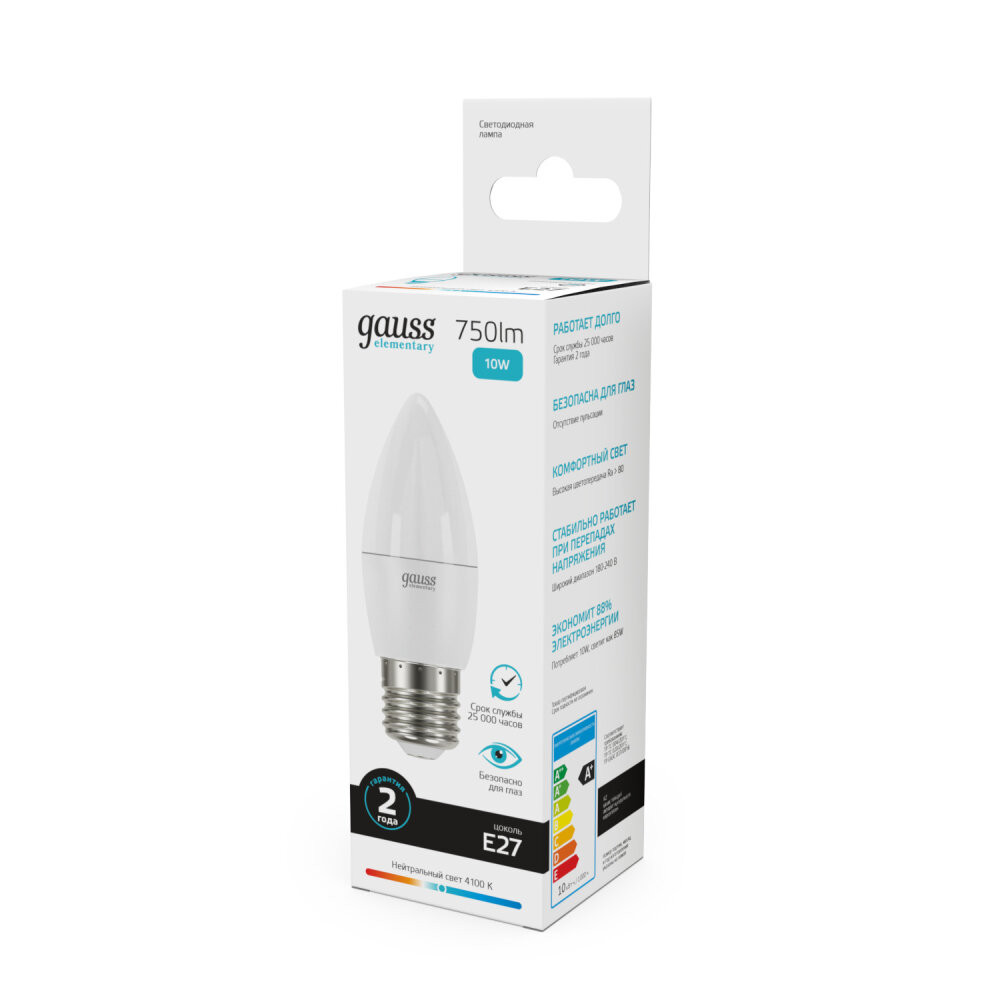 Лампа светодиодная LED 10 Вт 750 лм 4100К свеча нейтральный E27 AC 220В Elementary (GAUSS) 30220