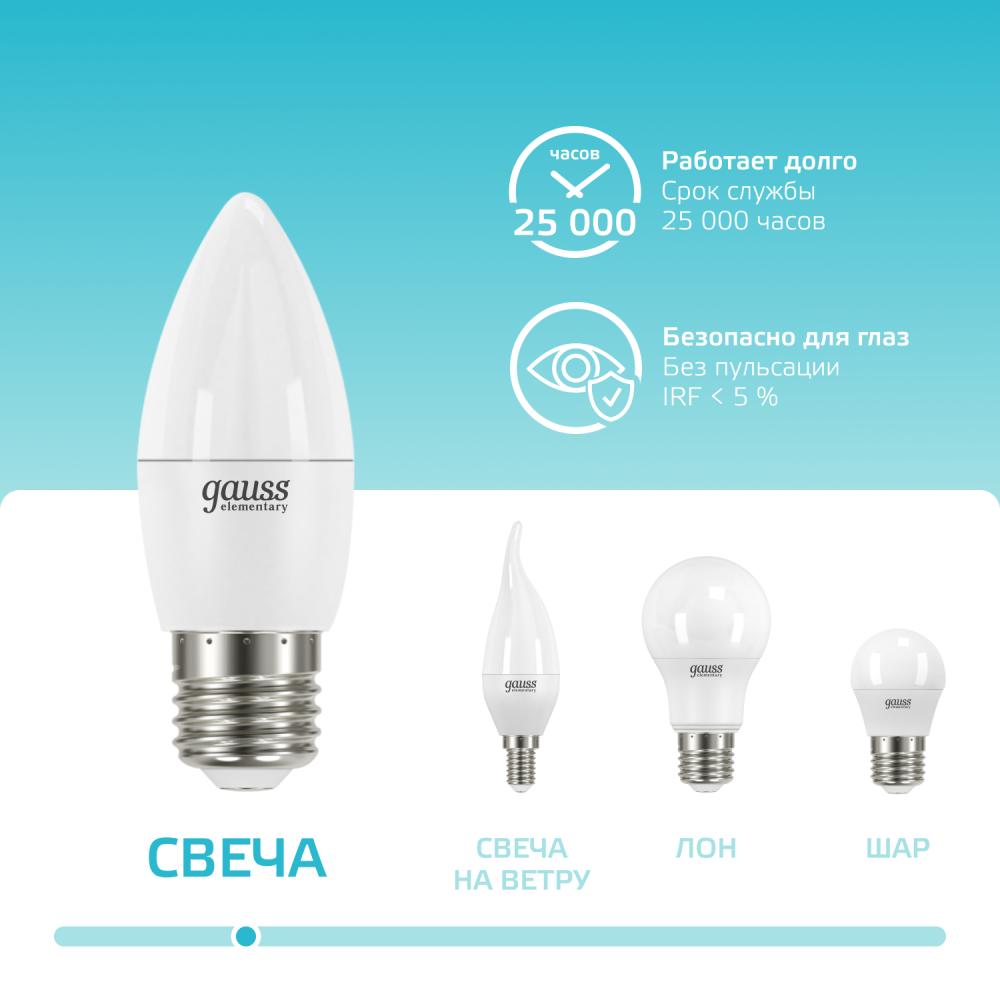 Светодиодные лампы Gauss Elementary Candle созданы в форме свечи. Лампы подойдут как для домашнего, так и для коммерческого использования. Такой тип освещения прекрасно смотрится в светильниках без плафонов или устанавливается в люстры и бра. Модель обладает широким диапазоном цветовых температур и мощностей, что поможет создать атмосферу тепла и уюта или концентрации. Равномерный спектр света создает зрительный комфорт в любом помещении. Данный тип освещения от Gauss обеспечивают стабильную работу в течение всего срока службы.