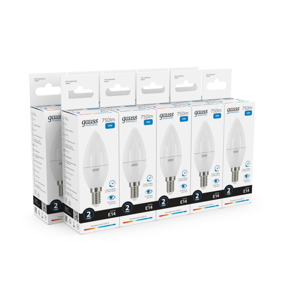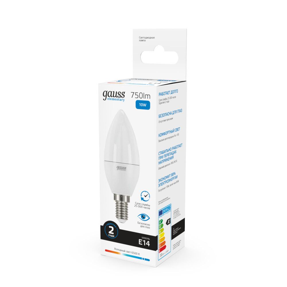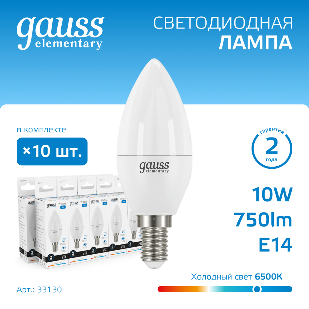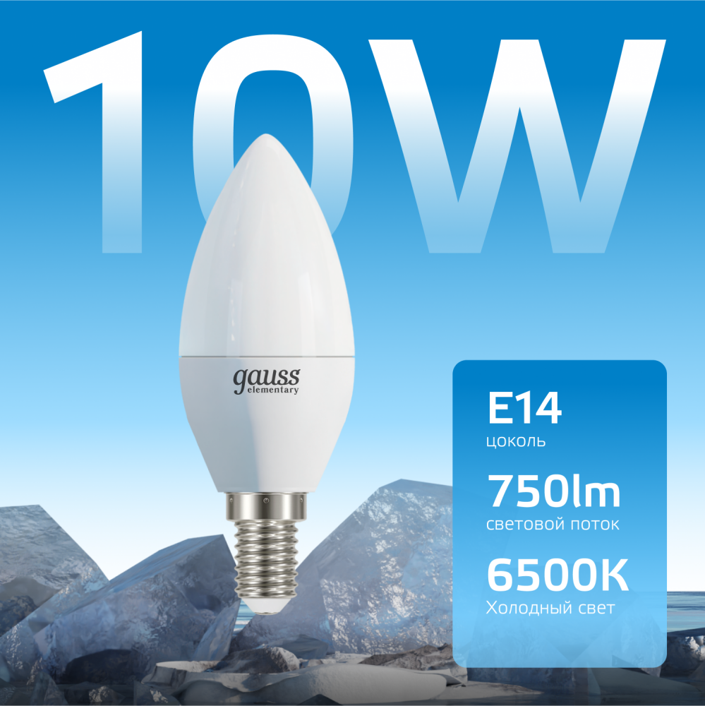 Полное описание товара Лампа светодиодная LED 10 Вт 750 лм 6500К свеча холодный E14 AC 220В Elementary (GAUSS) 33130