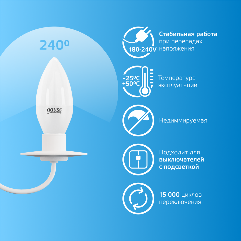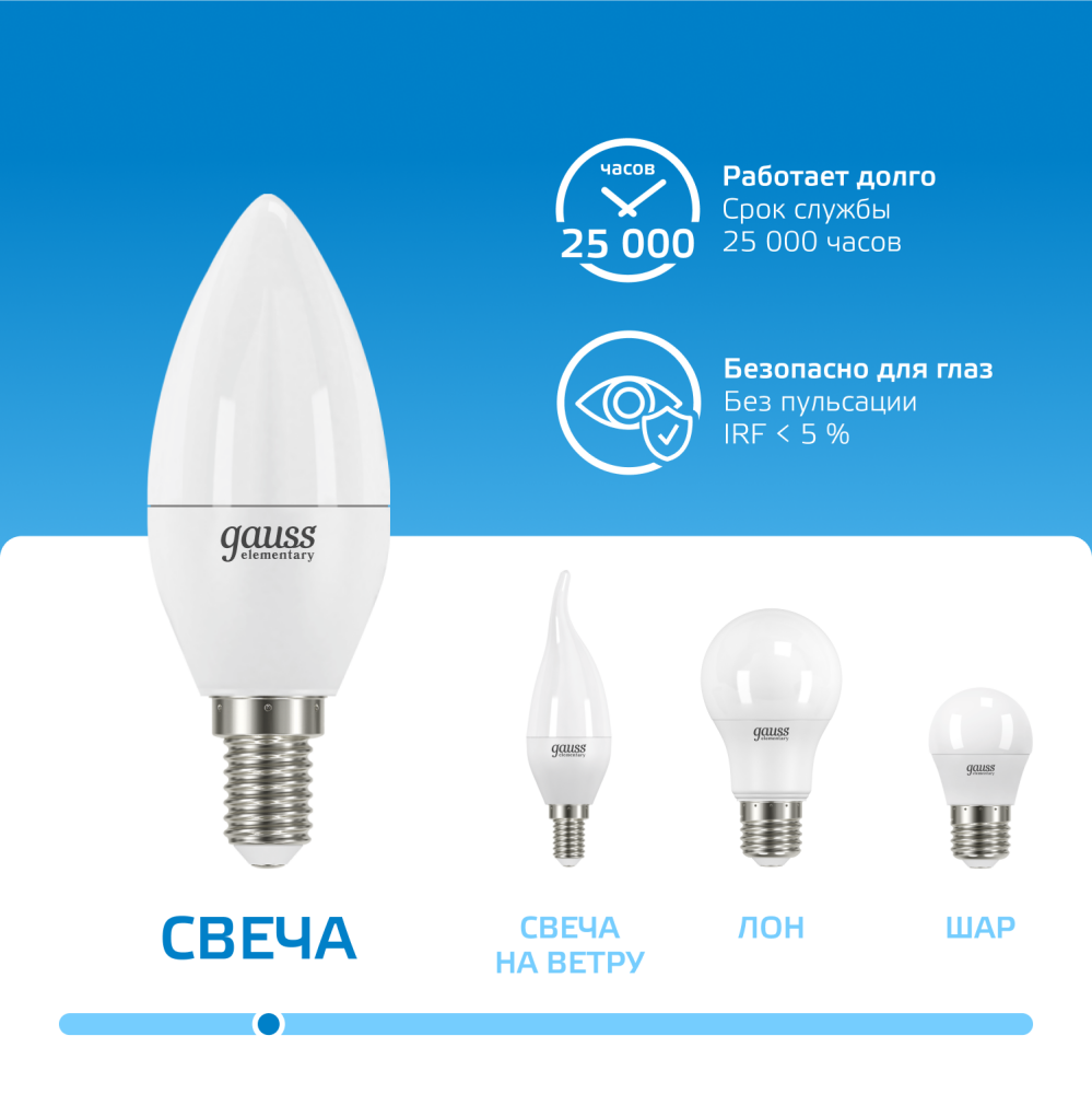 Светодиодные лампы Gauss Elementary Candle созданы в форме свечи. Лампы подойдут как для домашнего, так и для коммерческого использования. Такой тип освещения прекрасно смотрится в светильниках без плафонов или устанавливается в люстры и бра. Модель обладает широким диапазоном цветовых температур и мощностей, что поможет создать атмосферу тепла и уюта или концентрации. Равномерный спектр света создает зрительный комфорт в любом помещении. Данный тип освещения от Gauss обеспечивают стабильную работу в течение всего срока службы.