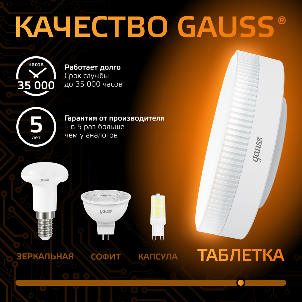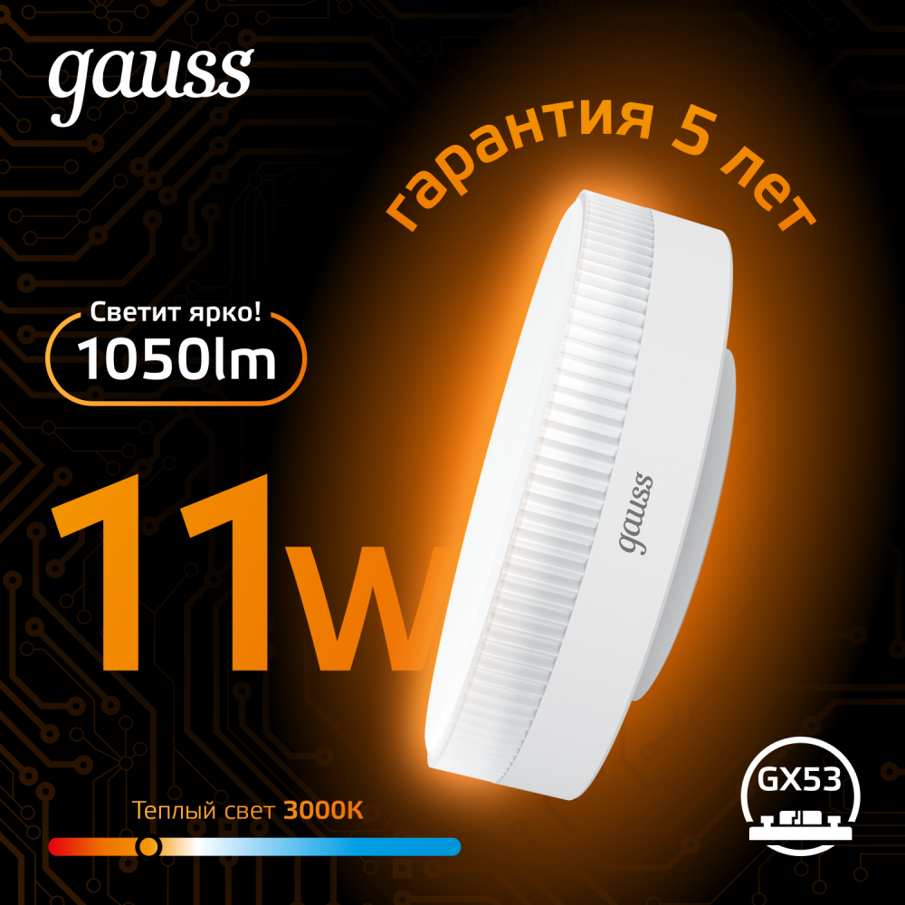 Полное описание товара Лампа светодиодная LED 11 Вт 1050 лм 3000К таблетка теплый GX53 AC 220В Black (GAUSS) 108008111