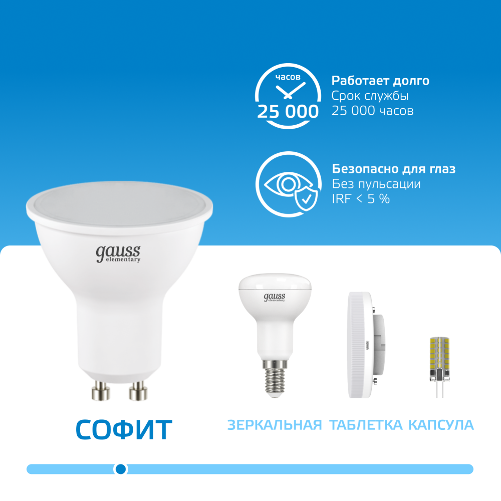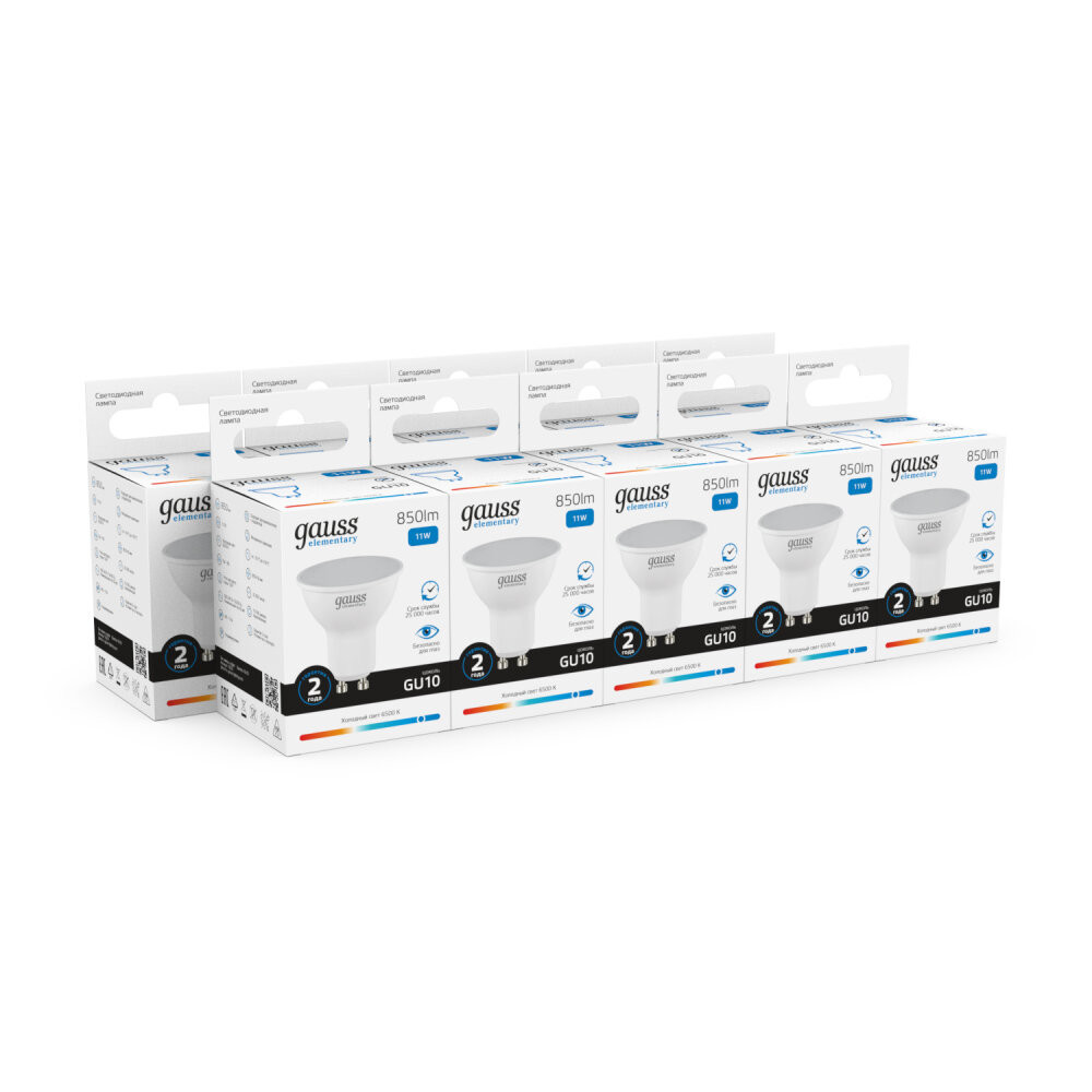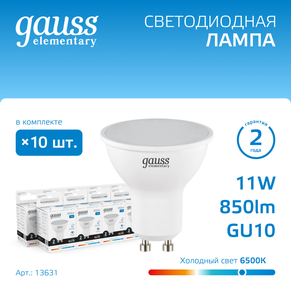 Полное описание товара Лампа светодиодная LED 11 Вт 850 лм 6500К софит MR16 холодный GU10 AC 220В Elementary Gauss (GAUSS) 13631