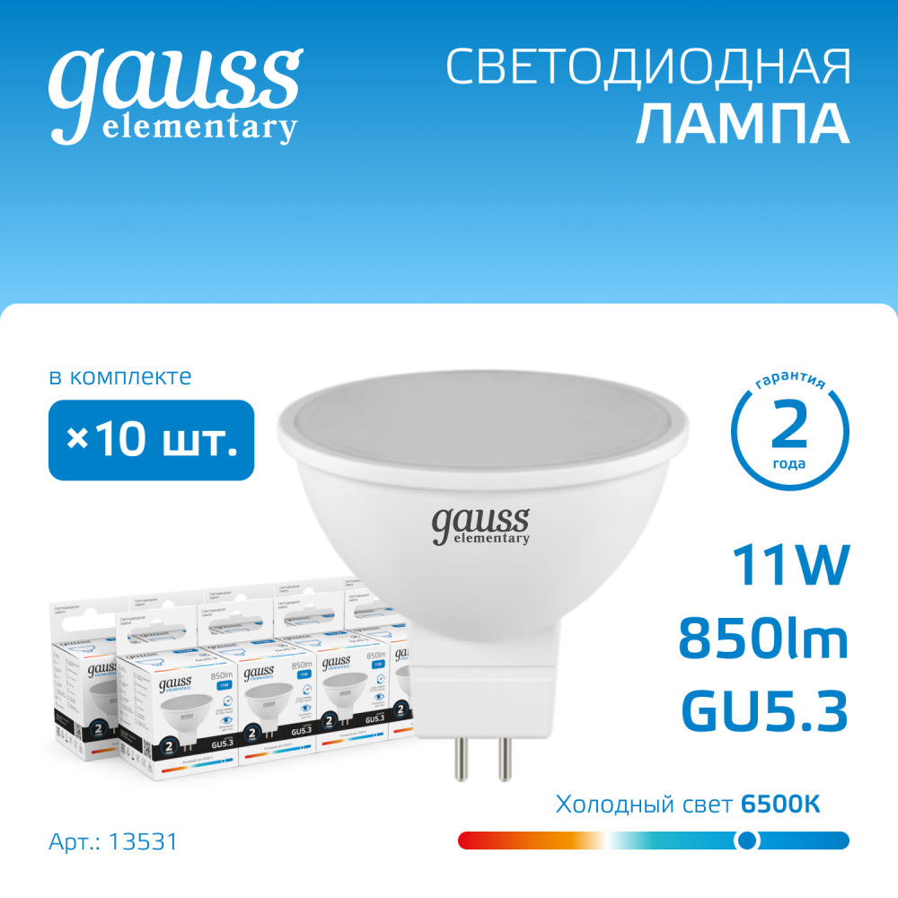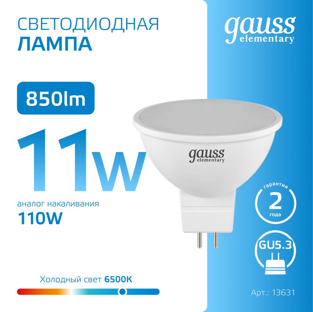 Полное описание товара Лампа светодиодная LED 11 Вт 850 лм 6500К софит MR16 холодный GU5.3 AC 220В Elementary (GAUSS) 13531