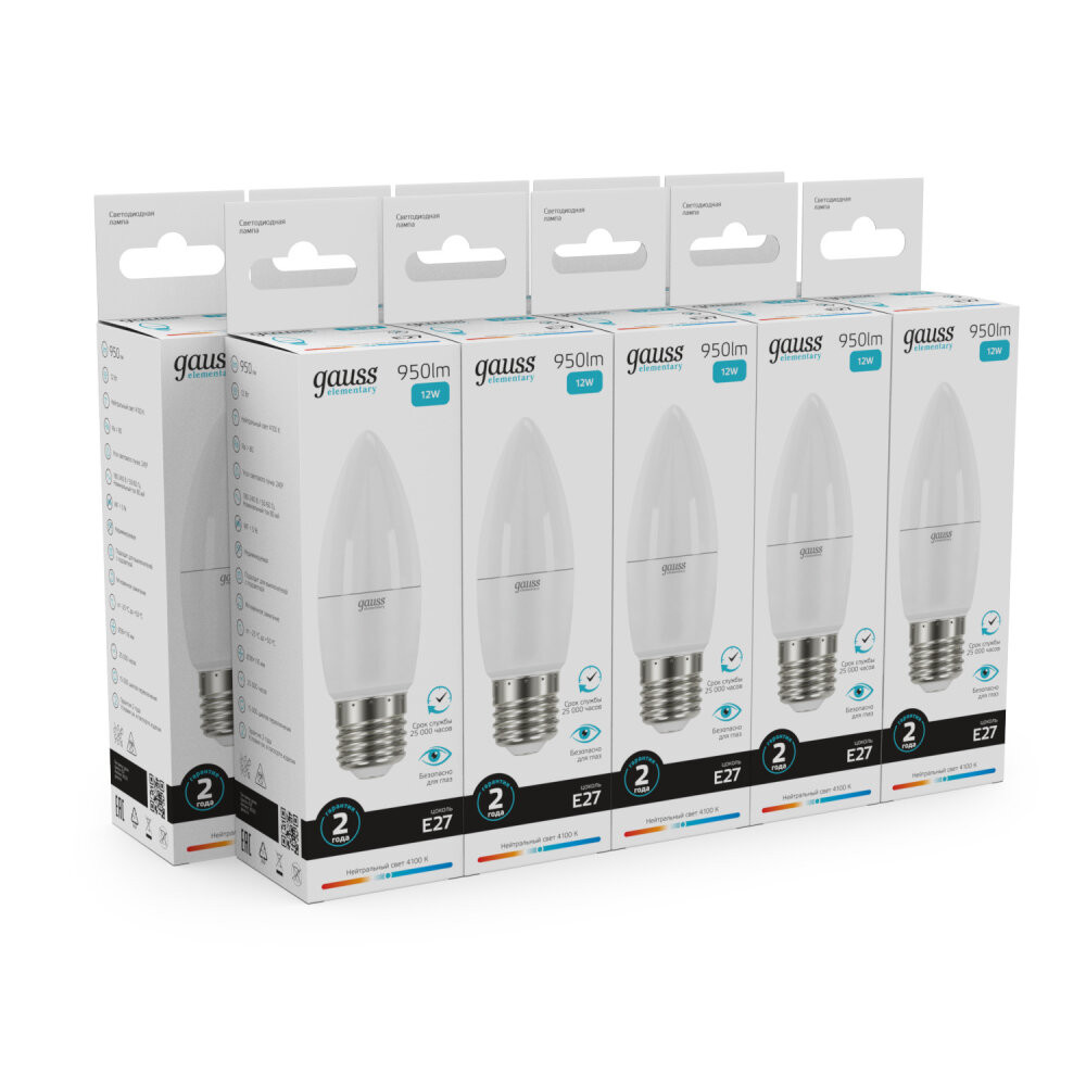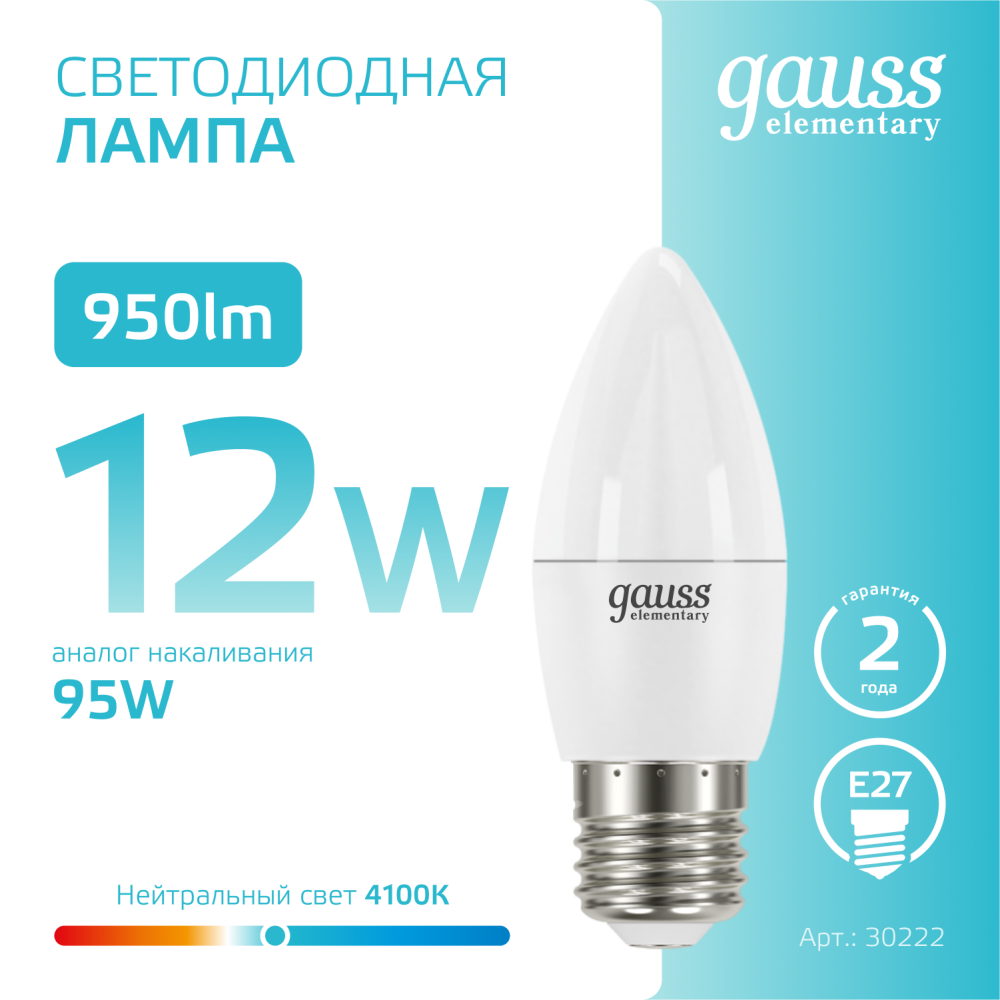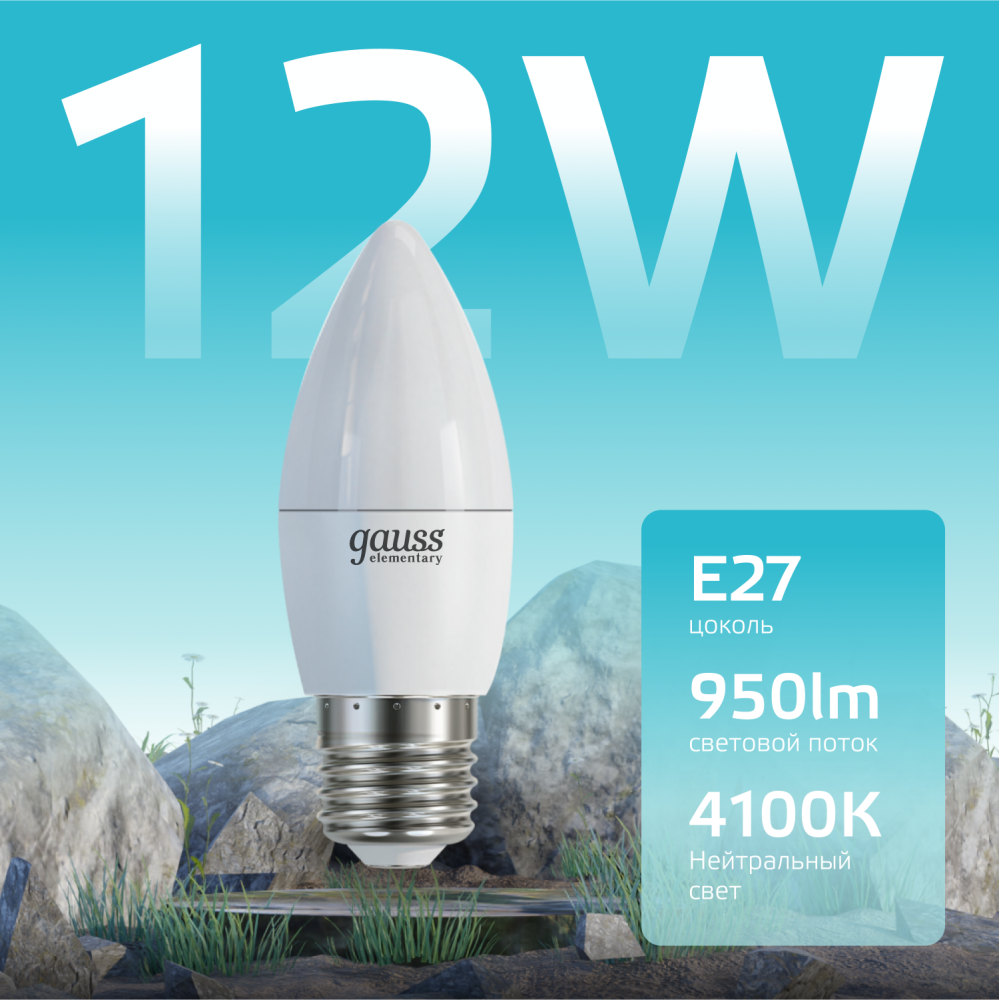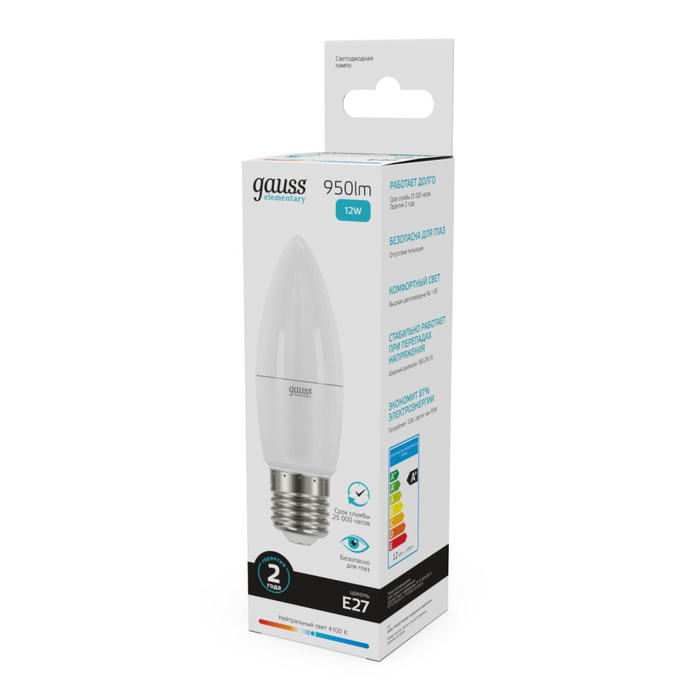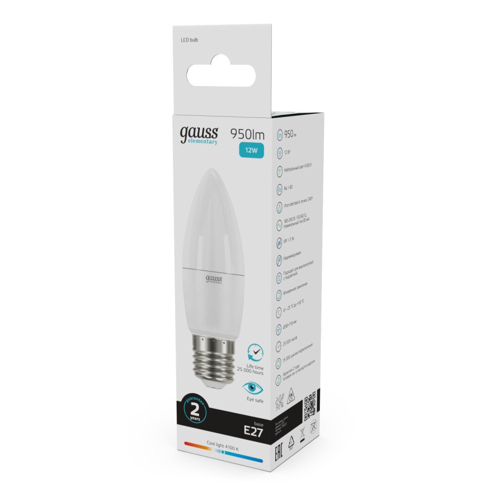 Полное описание товара Лампа светодиодная LED 12 Вт 950 лм 4100К свеча нейтральный E27 AC 220В Elementary (GAUSS) 30222